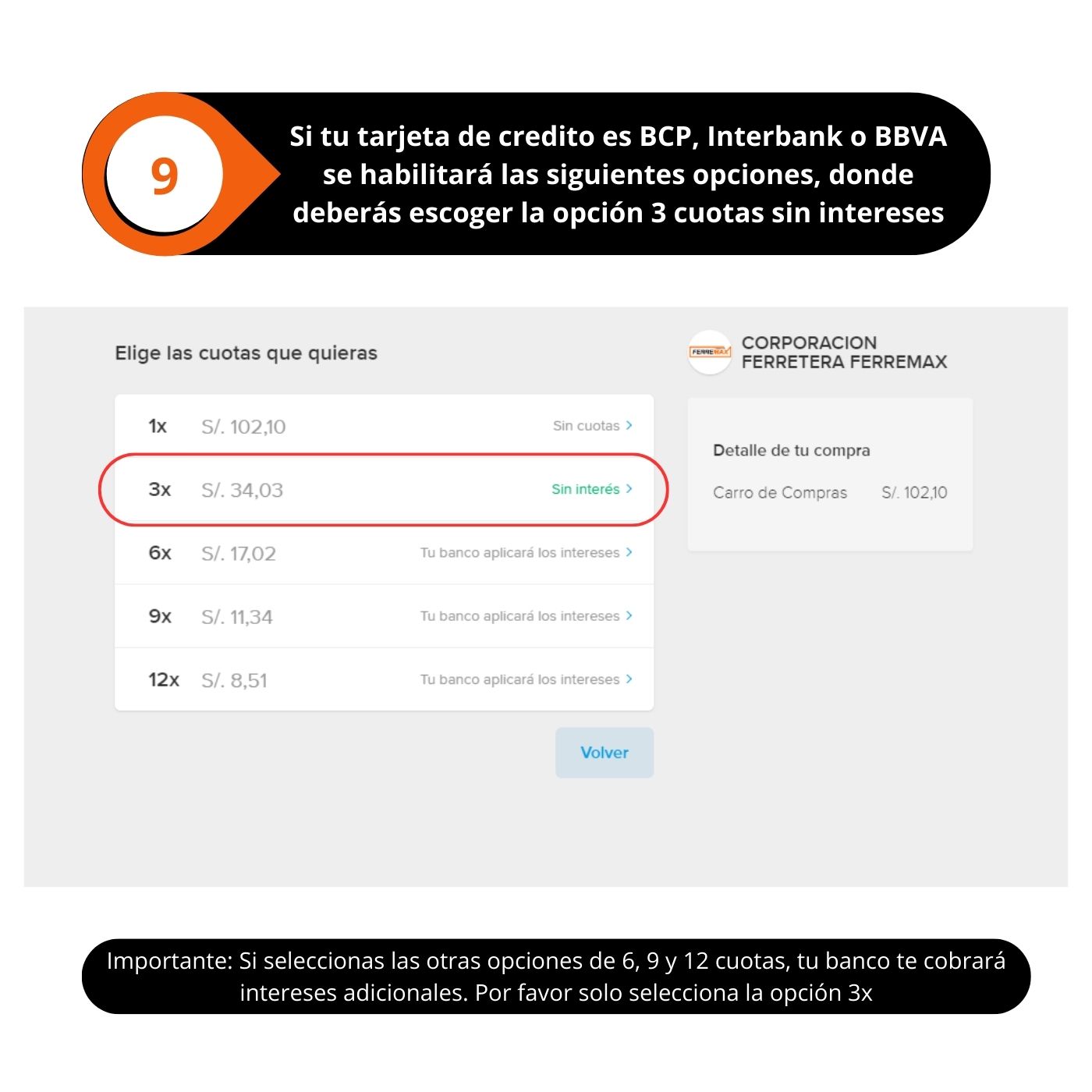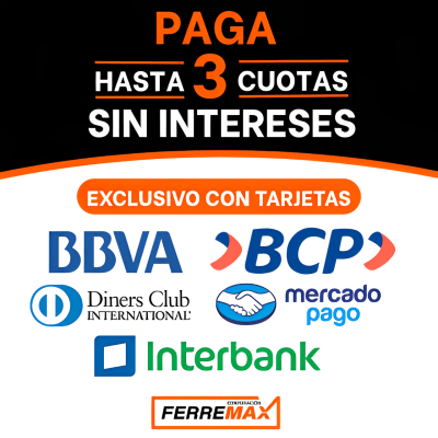 El beneficio de 3 cuotas sin intereses son válidos con tarjetas de crédito de los bancos INTERBANK, BCP (VISA), BBVA o DINERS CLUB.