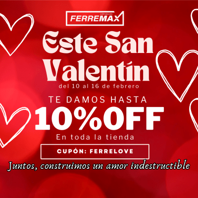 San Valentín llegó a FerreMax. Obtén los mejores precios en esta semana de ofertas. Adicional a todas las ofertas publicadas en la página web, podrás aplicar el cupón de descuento FERRELOVE en NUESTRA PAGINA WEB.