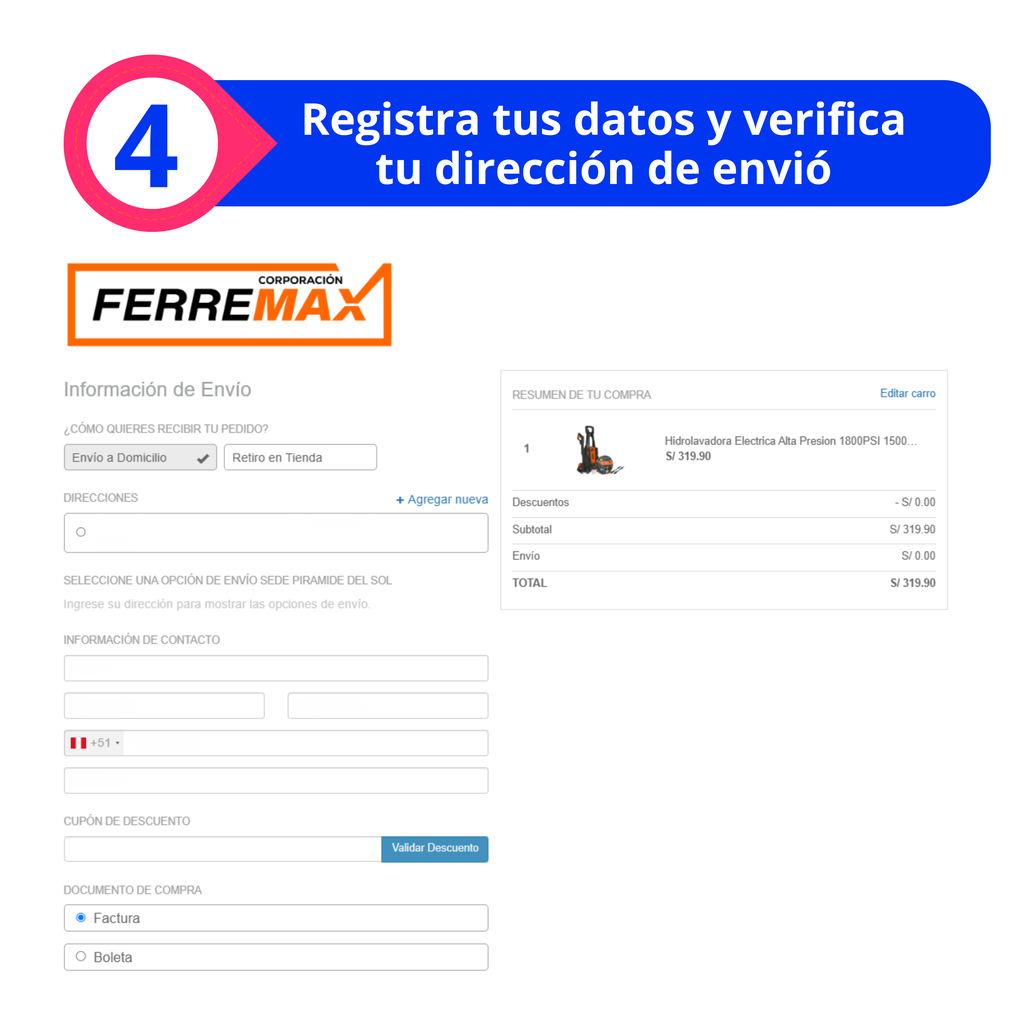 - El cupón de descuento es aplicable exclusivamente para compras realizadas en la pagina web www.corporacionferremax.com, en nuestro punto de venta directo y redes sociales (WhatsApp, Facebook y Tik Tok). No aplica para otras tiendas en las que Corporación FerreMax venda (Falabella.com, Ripley, Promart, Shopstar, entre otros)