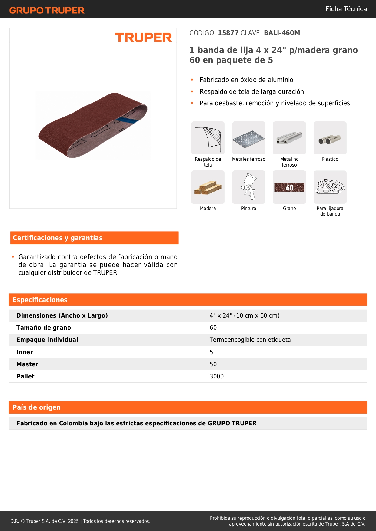 1 banda de lija 4 x 24´´ p/madera grano 60 Truper