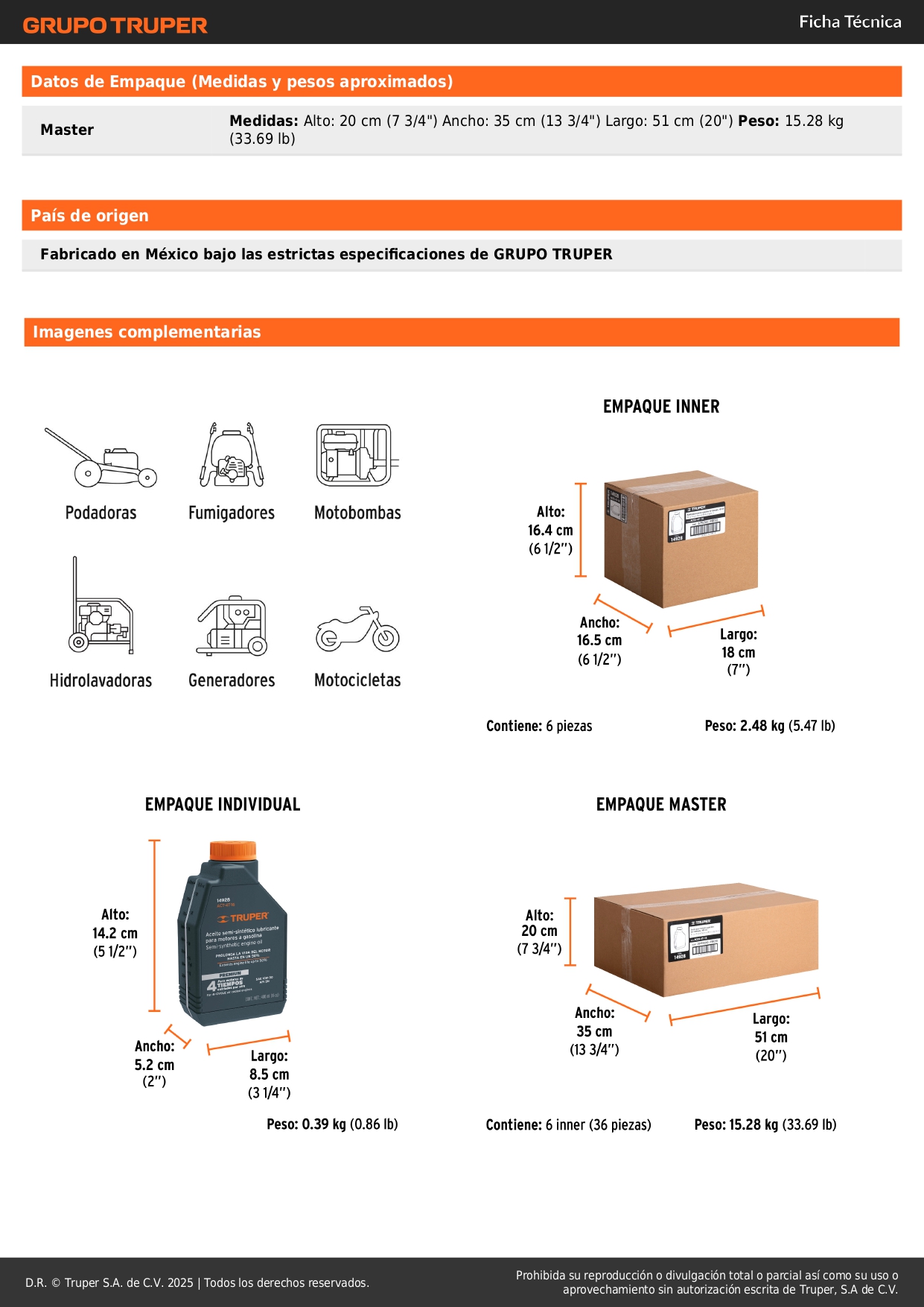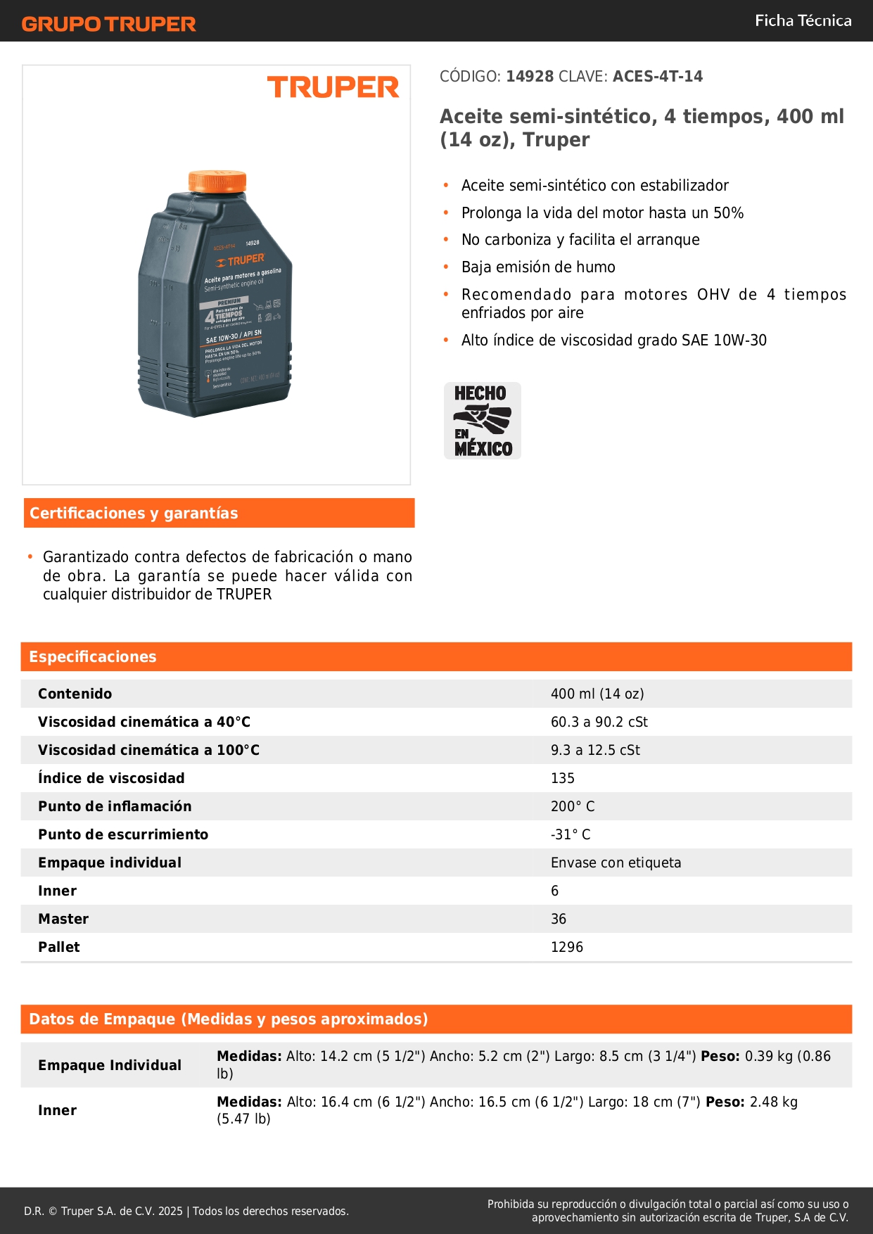 - Alto índice de viscosidad grado SAE 10W-30.
