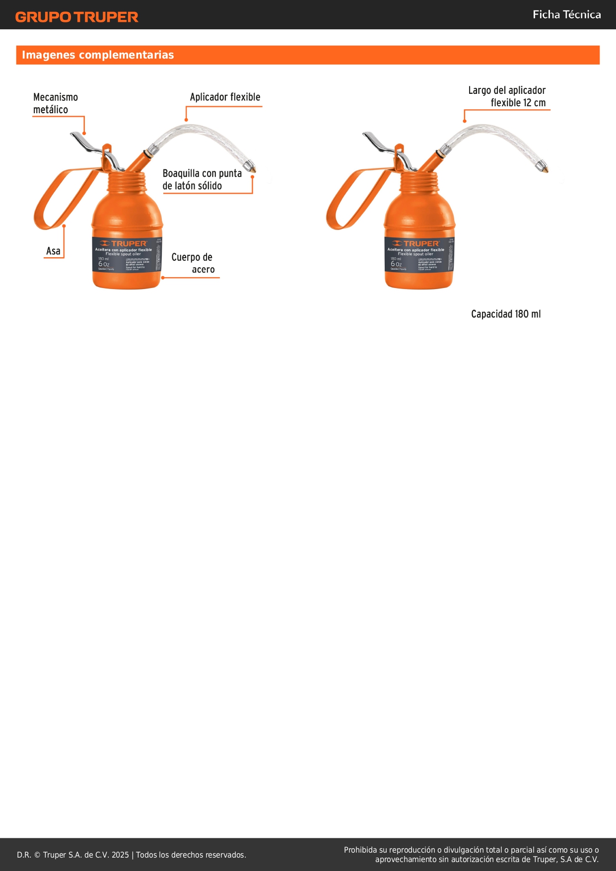 Aceitera de 180 ml 6 Oz con Aplicador Flexible Truper Stock por sucursal Stock por sucursal S/ 10.90 cantidad Agregar al carro Avísame cuando llegue Aplicadores flexibles.Mecanismos internos metálicos.Boquillas con punta de latón sólido.