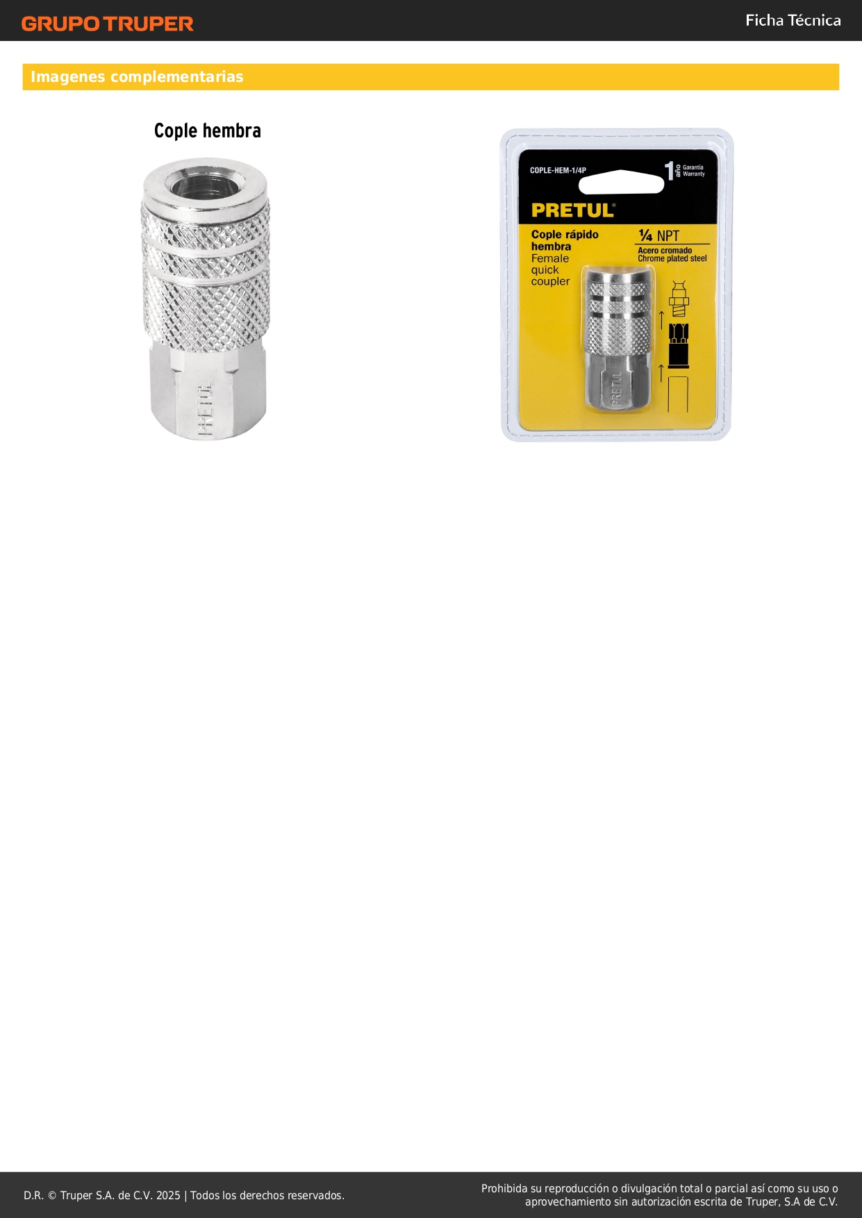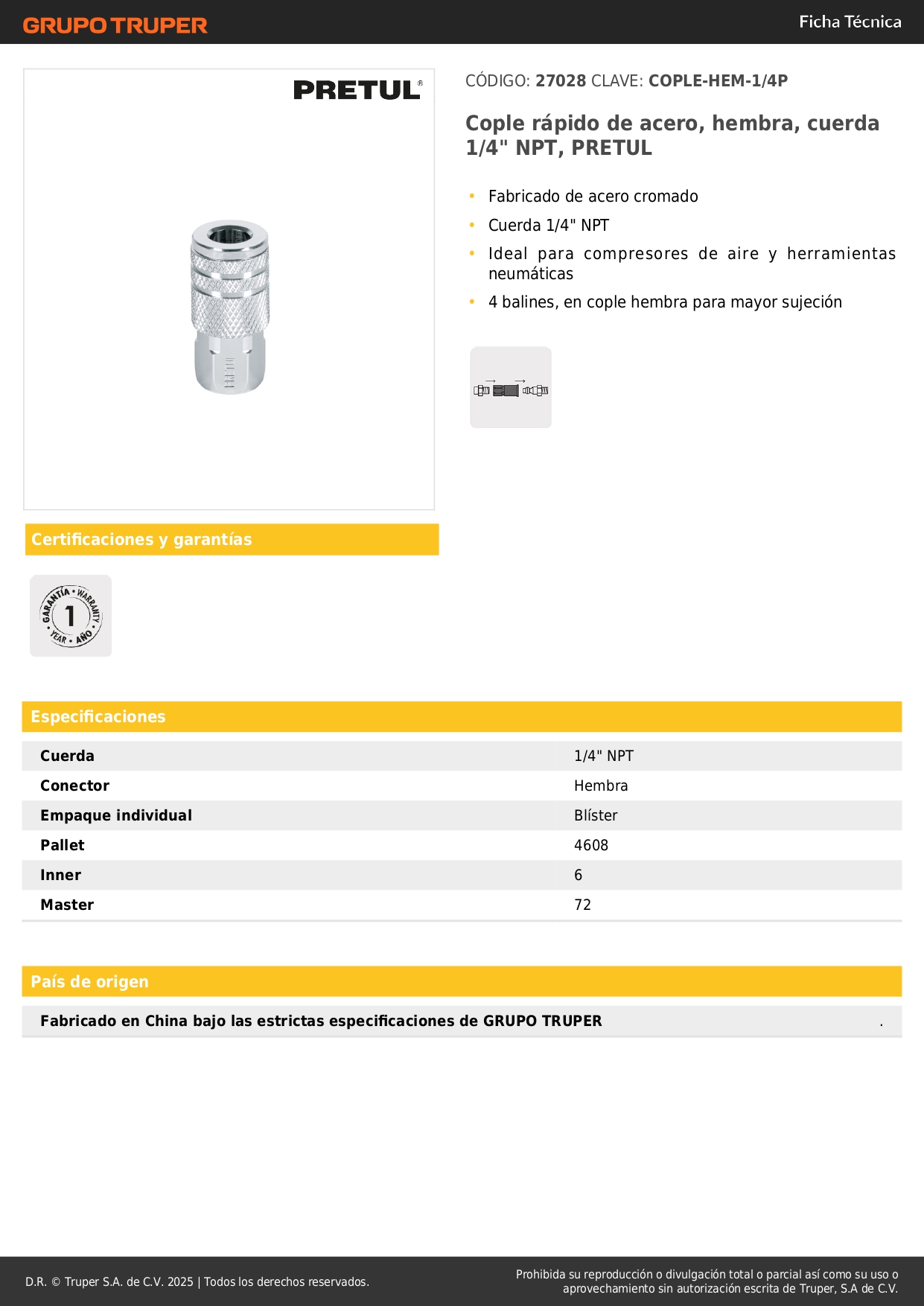 Acople de acero con cuerda 1/4" NPT hembra Pretul Stock por sucursal Stock por sucursal S/ 10.00 cantidad Agregar al carro Avísame cuando llegue Fabricado en acero cromado.