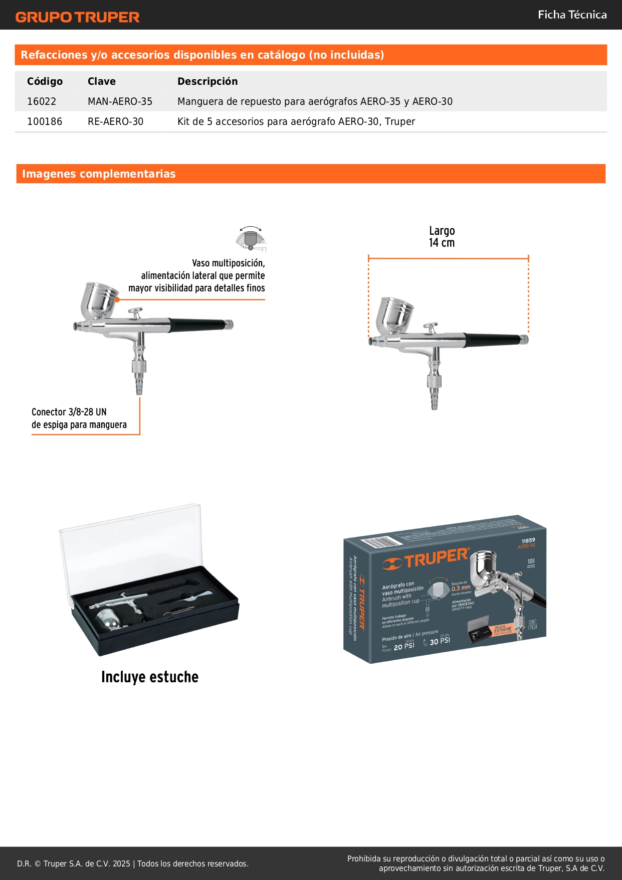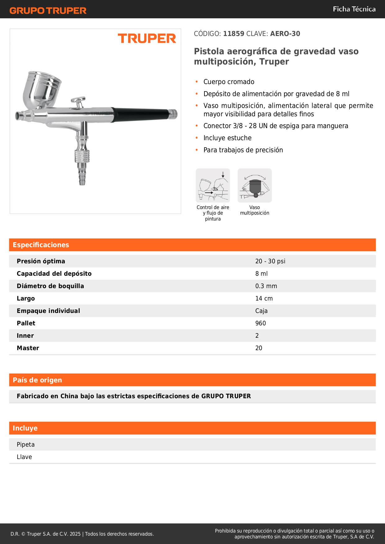 Aerógrafo de gravedad Vaso multiposición Boquilla 0.3 mm Truper