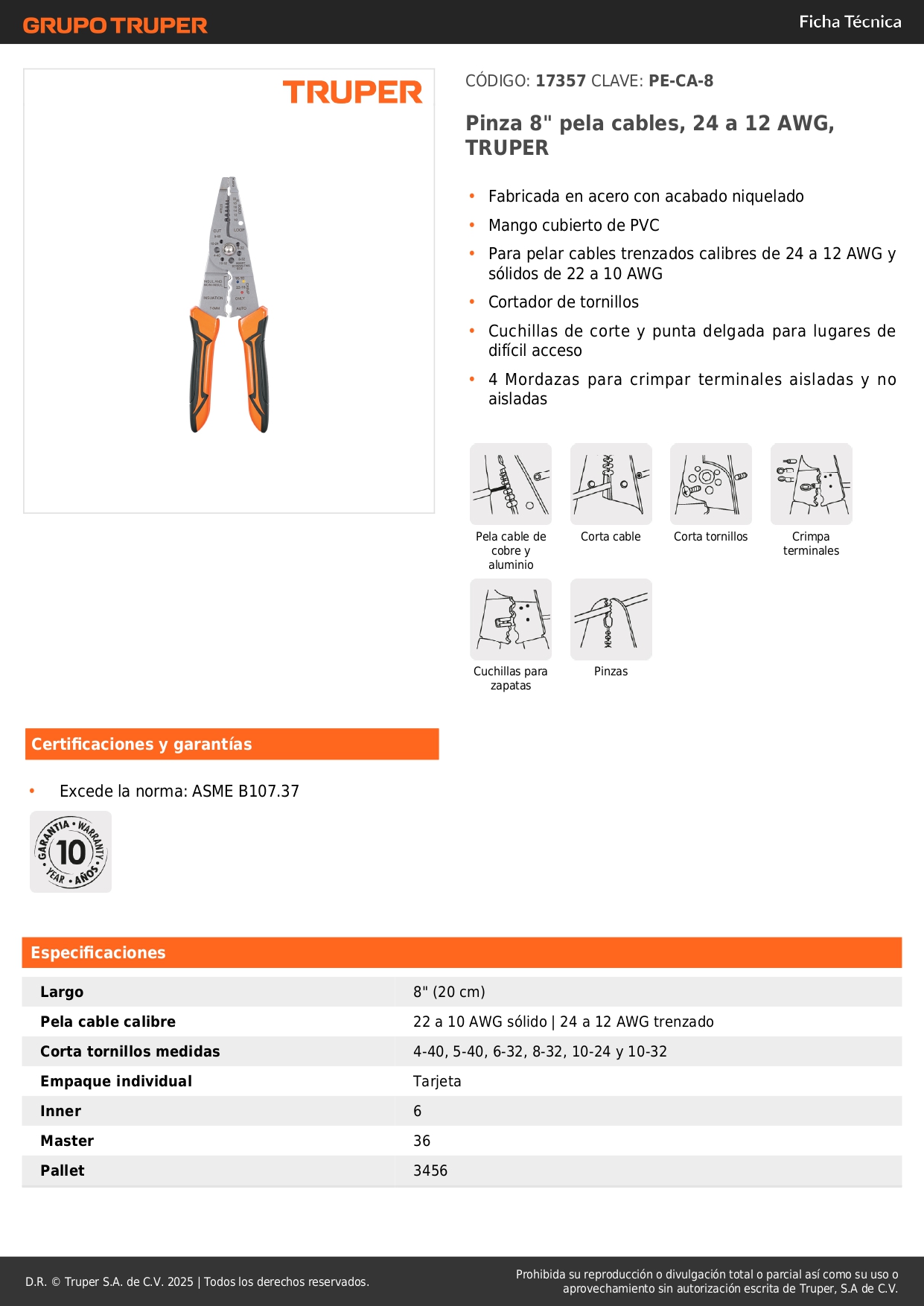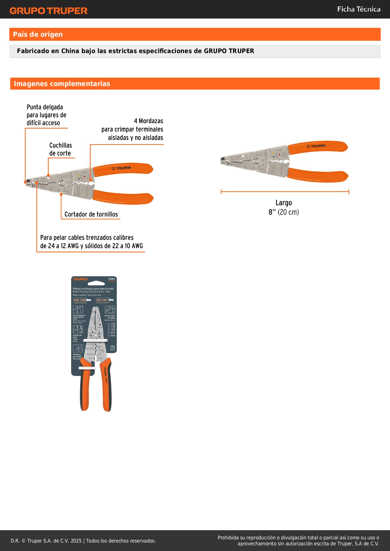 Alicate 8" pela cables 24 a 12 AWG Truper
