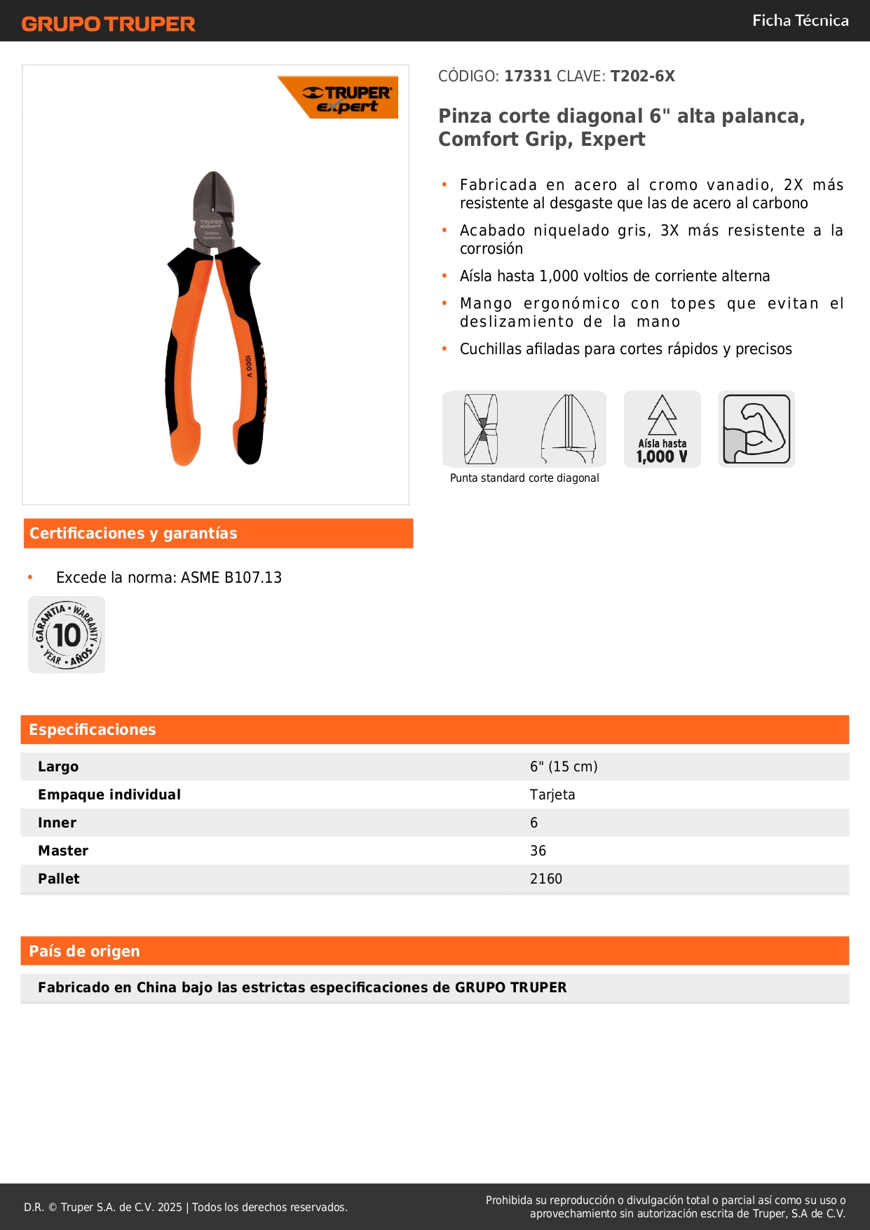 Alicate de corte 6" Truper Expert