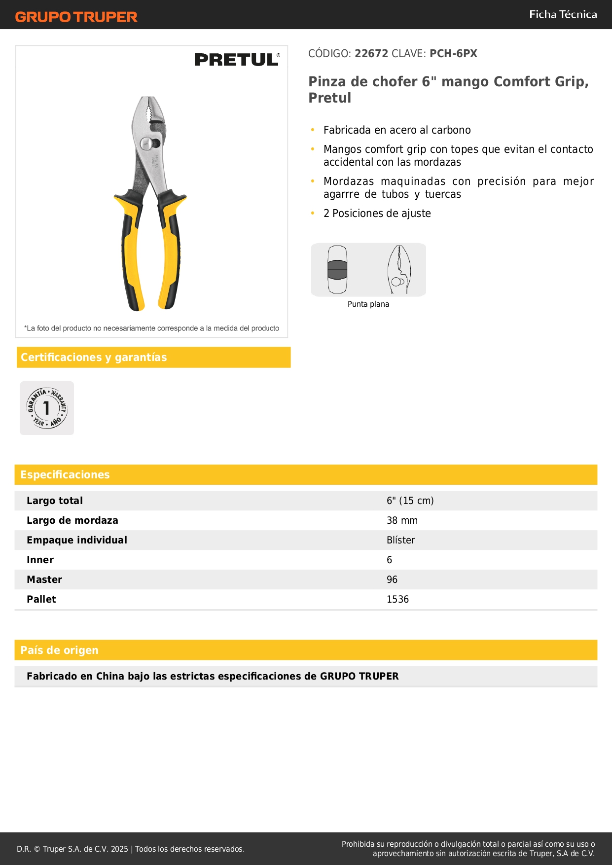 Alicate de mecánico 6´´ mango Comfort Grip, Pretul