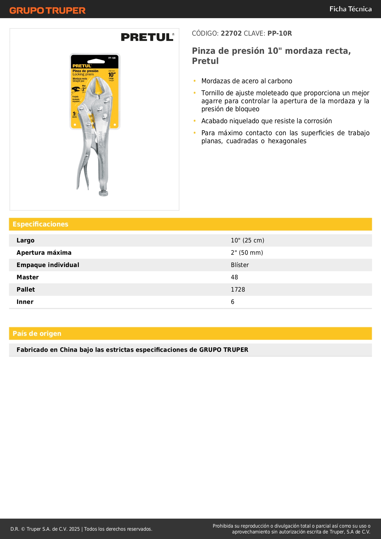 Pinza de presión 10" mordaza recta, Pretul