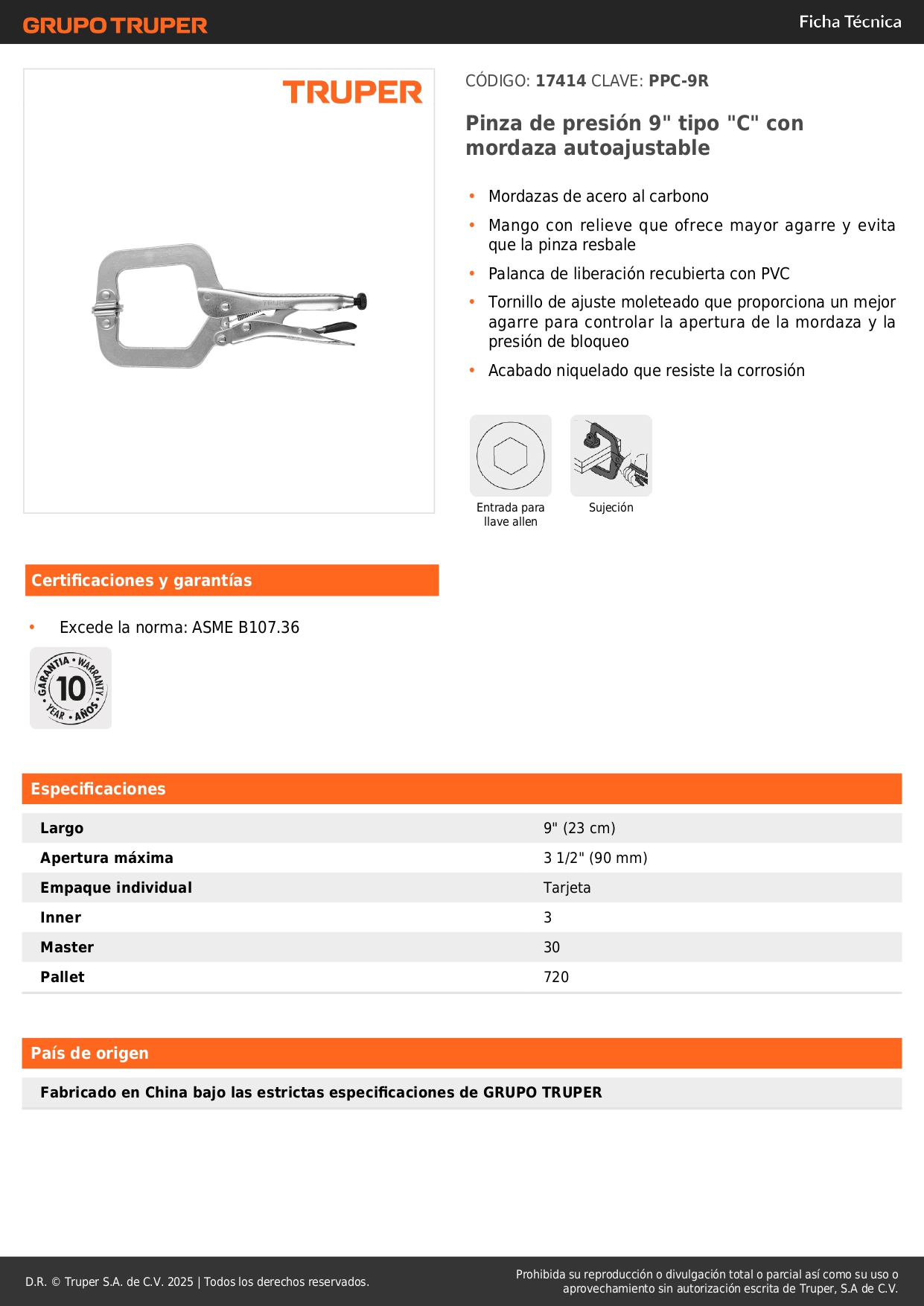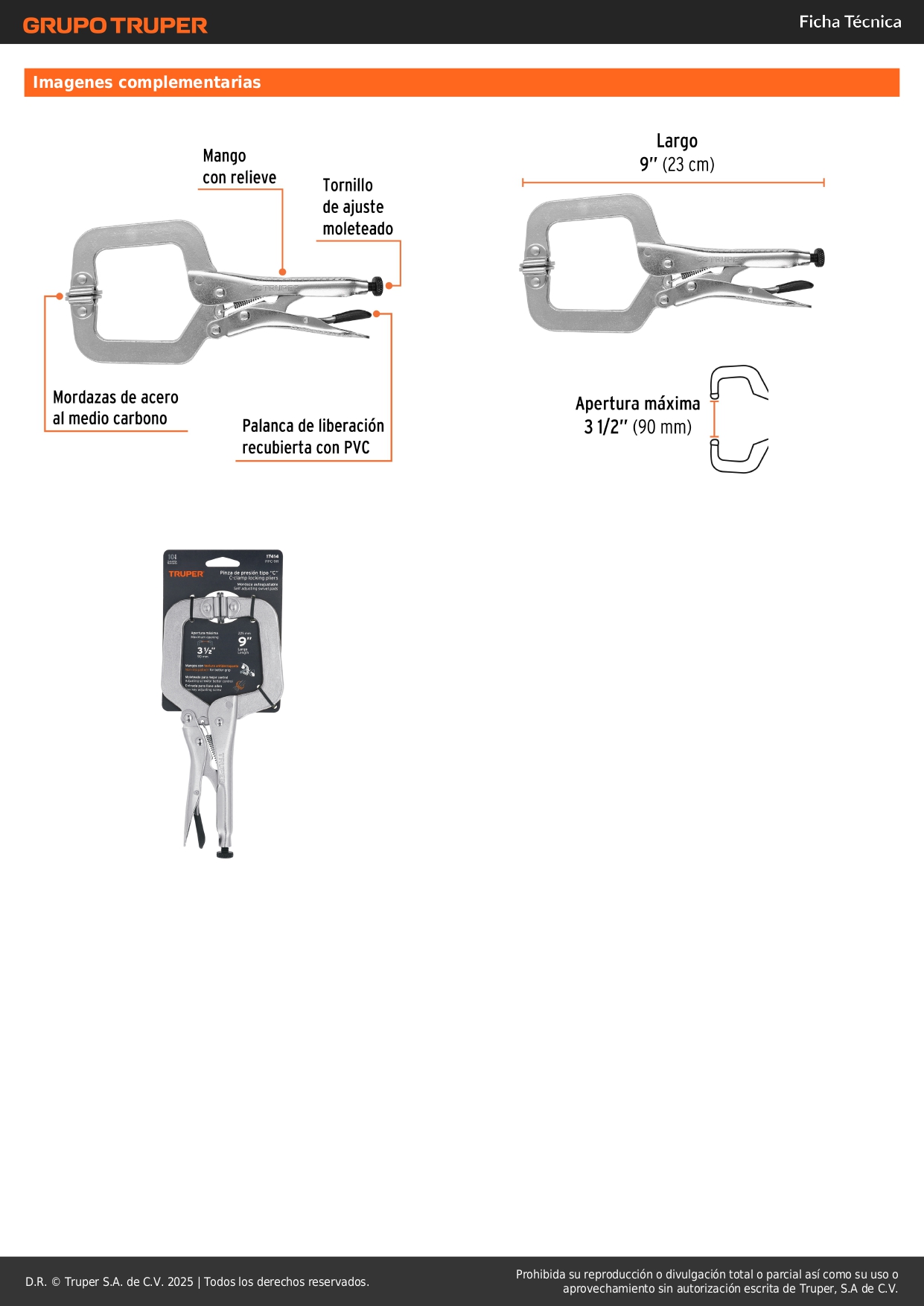 Alicate de presión tipo C mordaza ajustable 9" Truper
