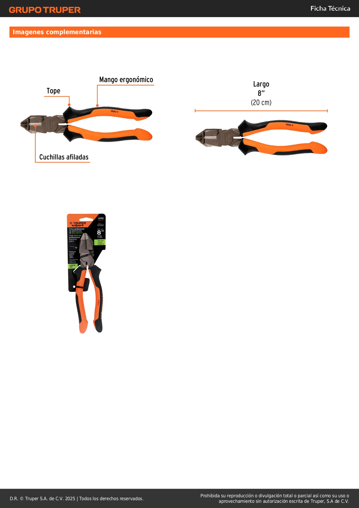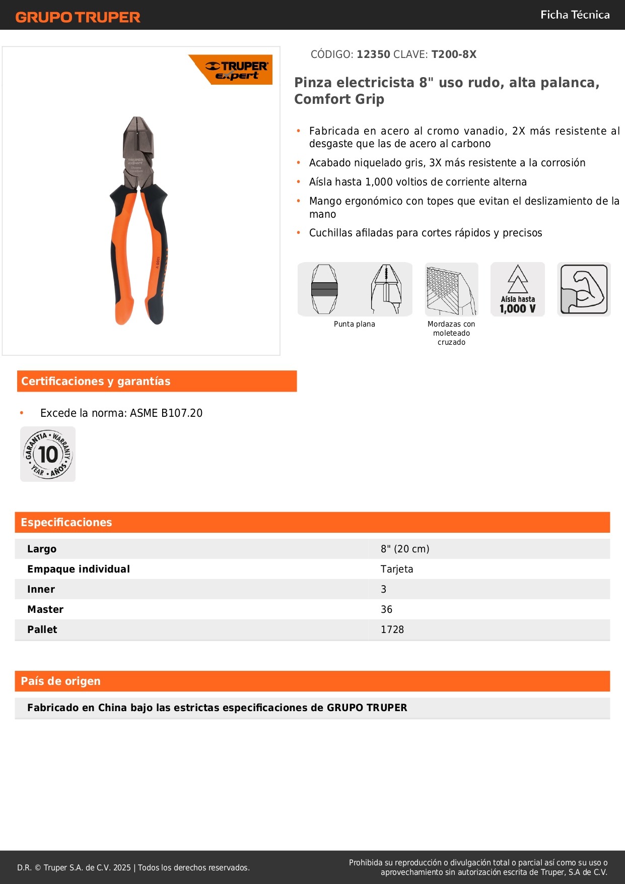 Alicate universal profesional 8" mango confort grip Truper Expert