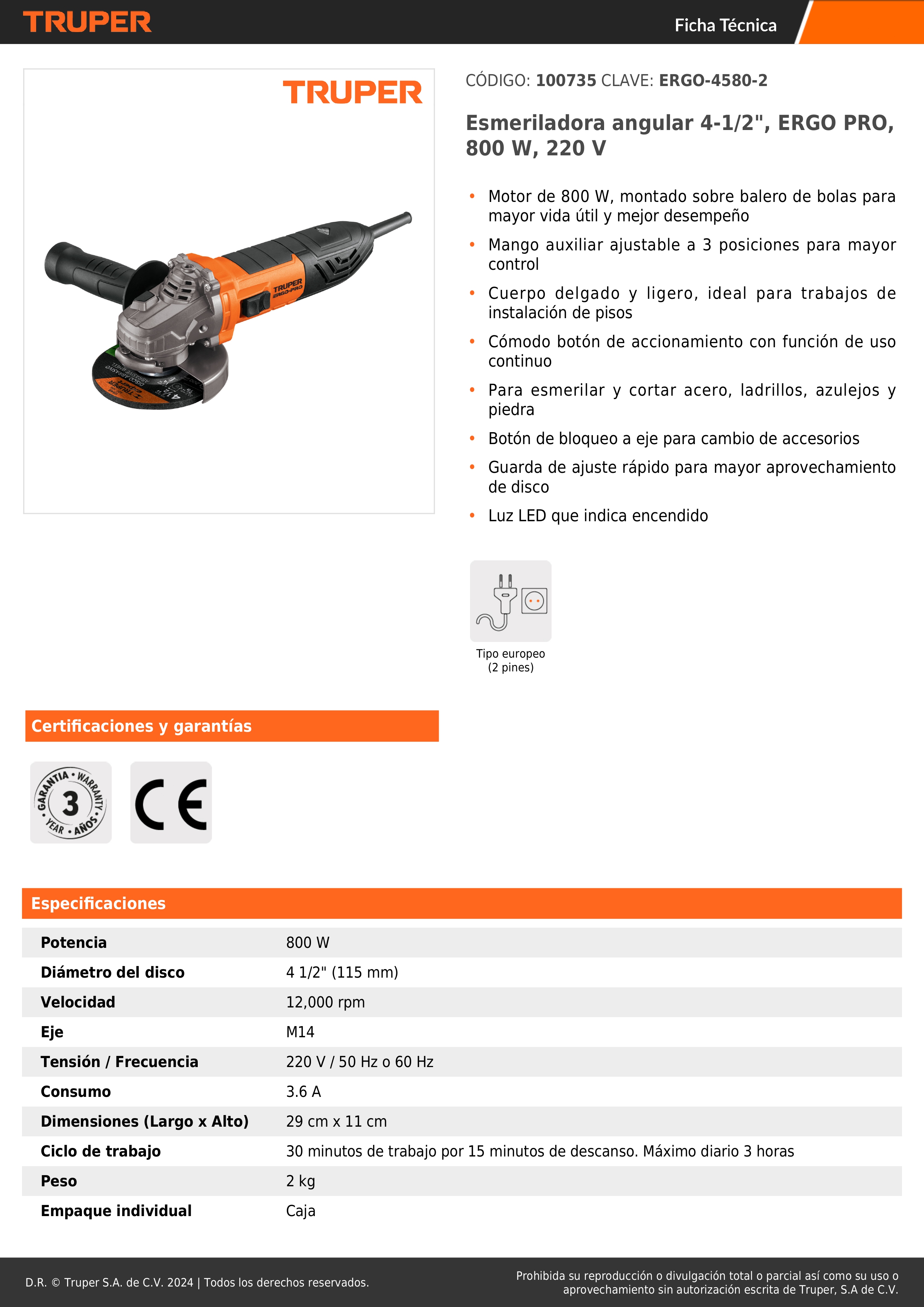 Esmeriladora angular 4-1/2", ERGO PRO, 800 W, 220 V