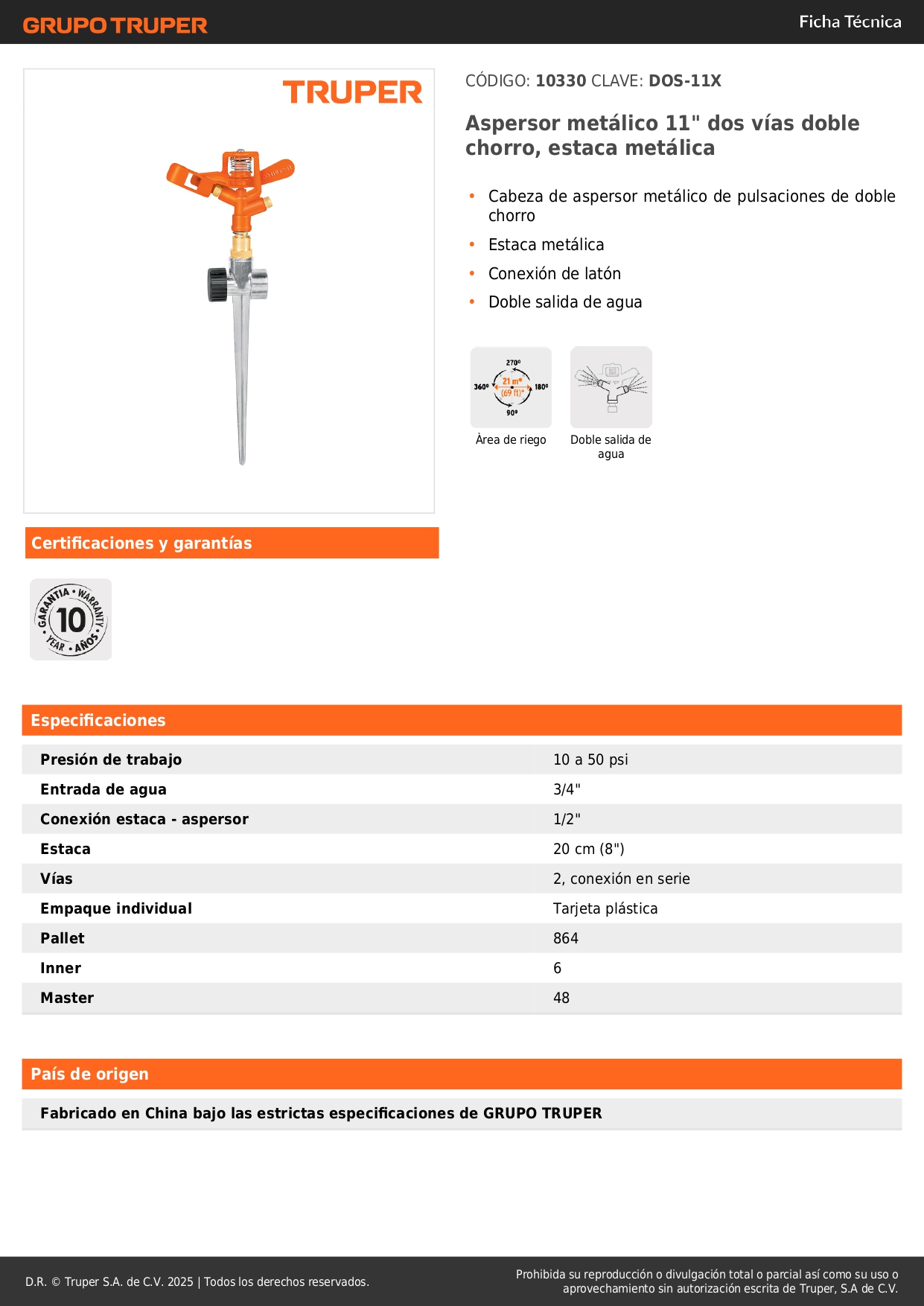 Aspersor metalico 2 vias estaca metalica 11" Truper