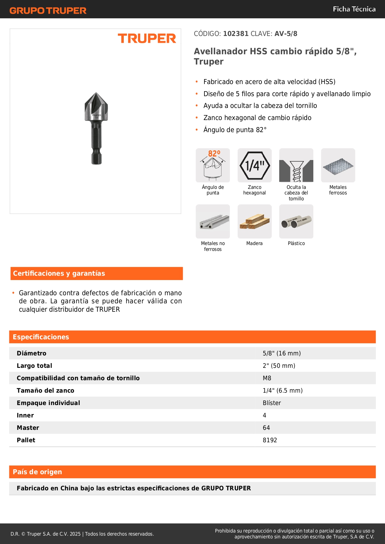 -Diseño de 5 filos para corte rápido y avellanado limpio