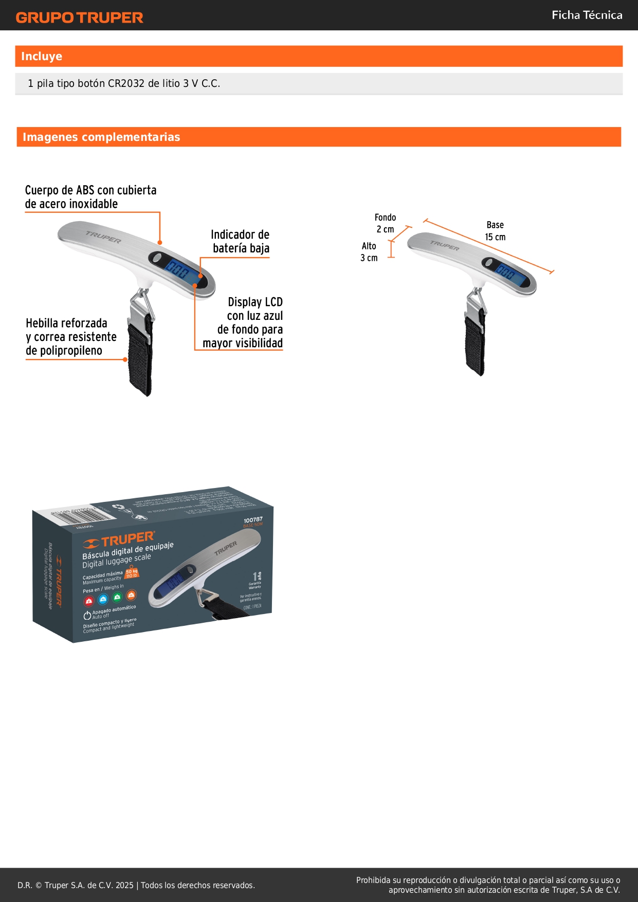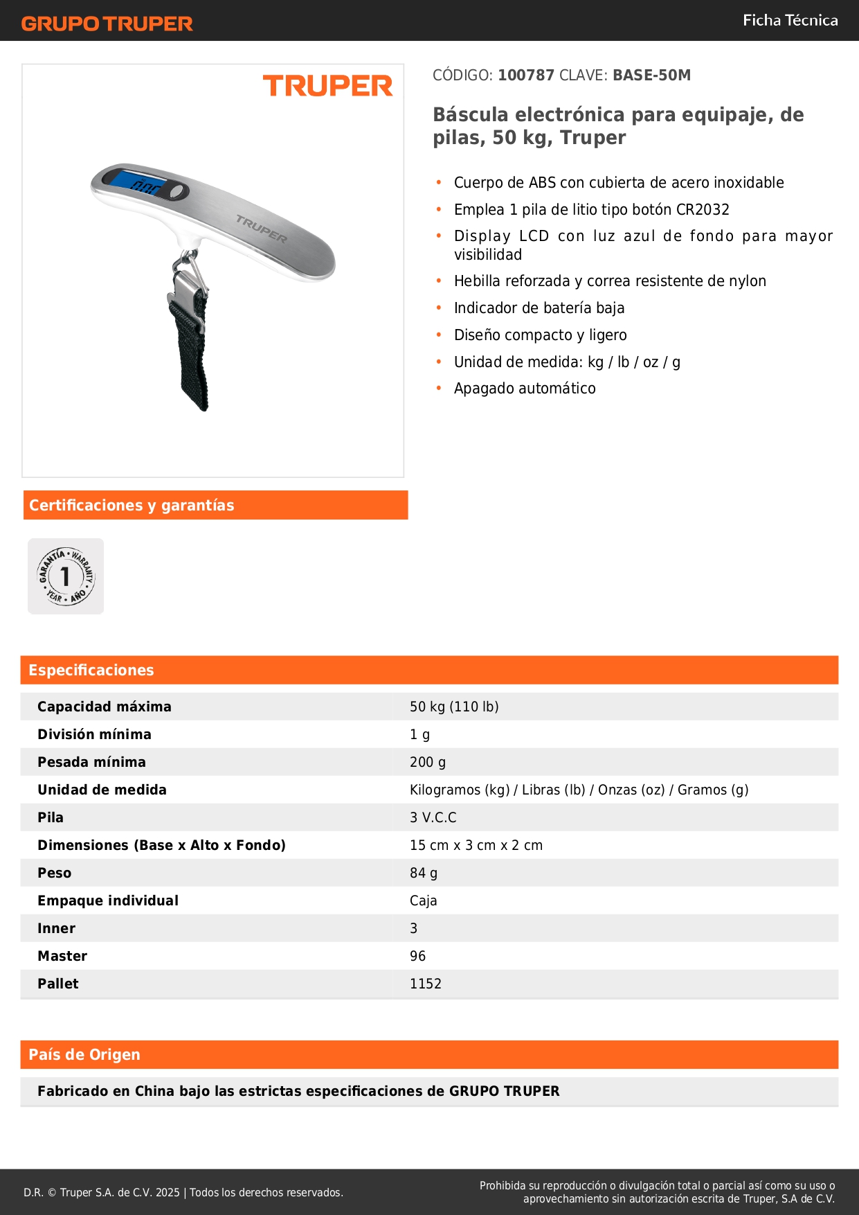 Báscula electrónica para equipaje, de pilas, 50 kg, Truper