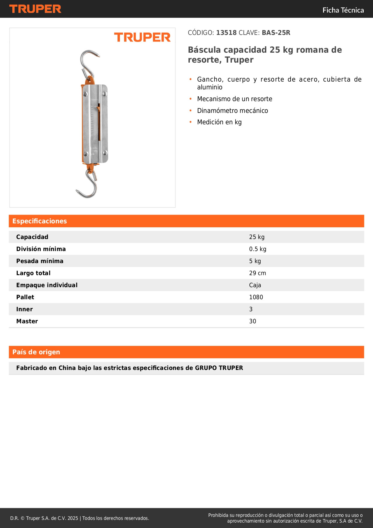 Báscula capacidad 25 kg romana de resorte, TRUPER