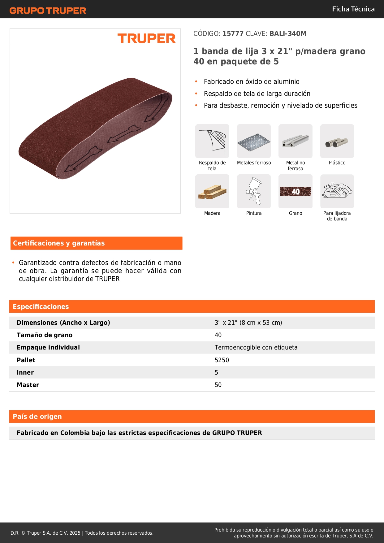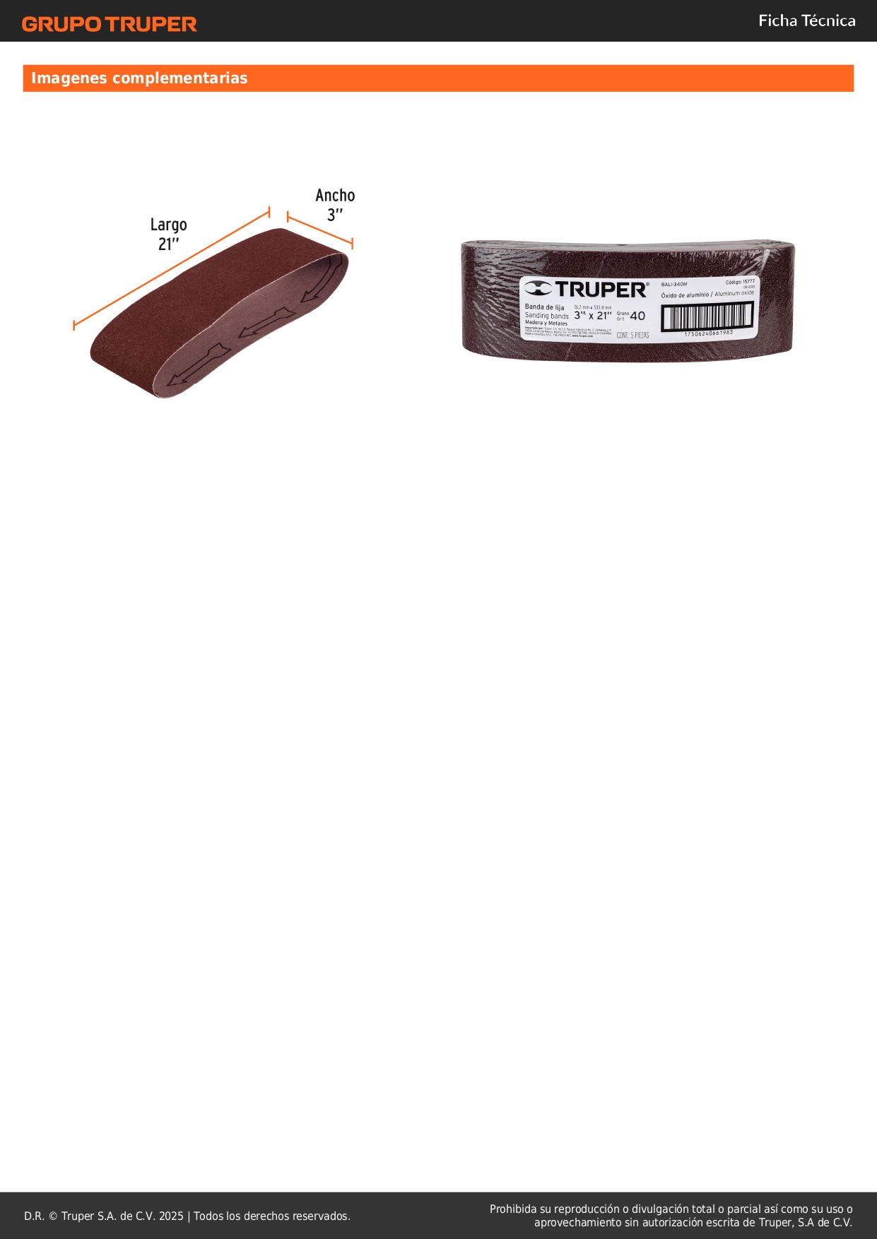 Banda de lija 3 x 21" p/madera grano 40 por unidad Truper
