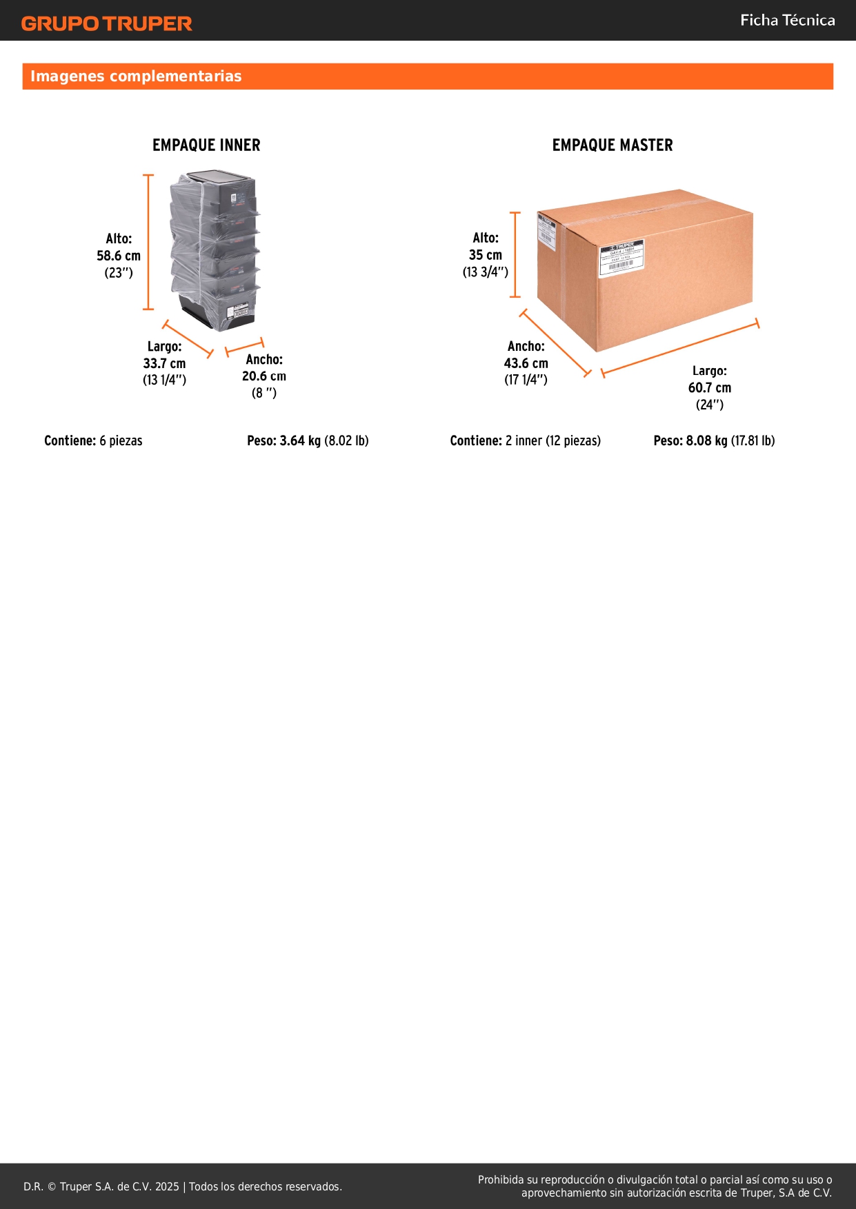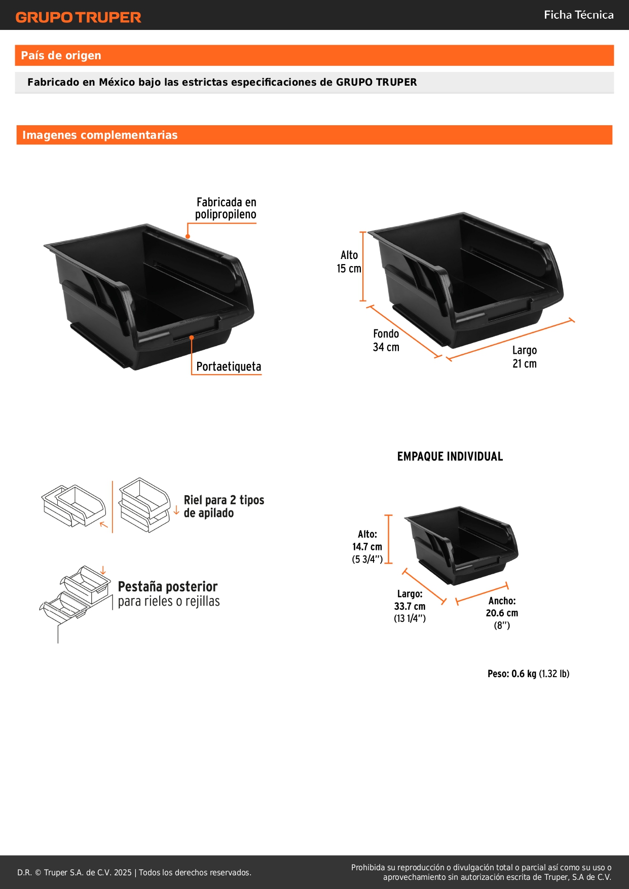 Empaque Individual Medidas: Alto: 14.7 cm (5 3/4") Ancho: 20.6 cm (8") Largo: 33.7 cm (13 1/4") Peso: 0.6 kg