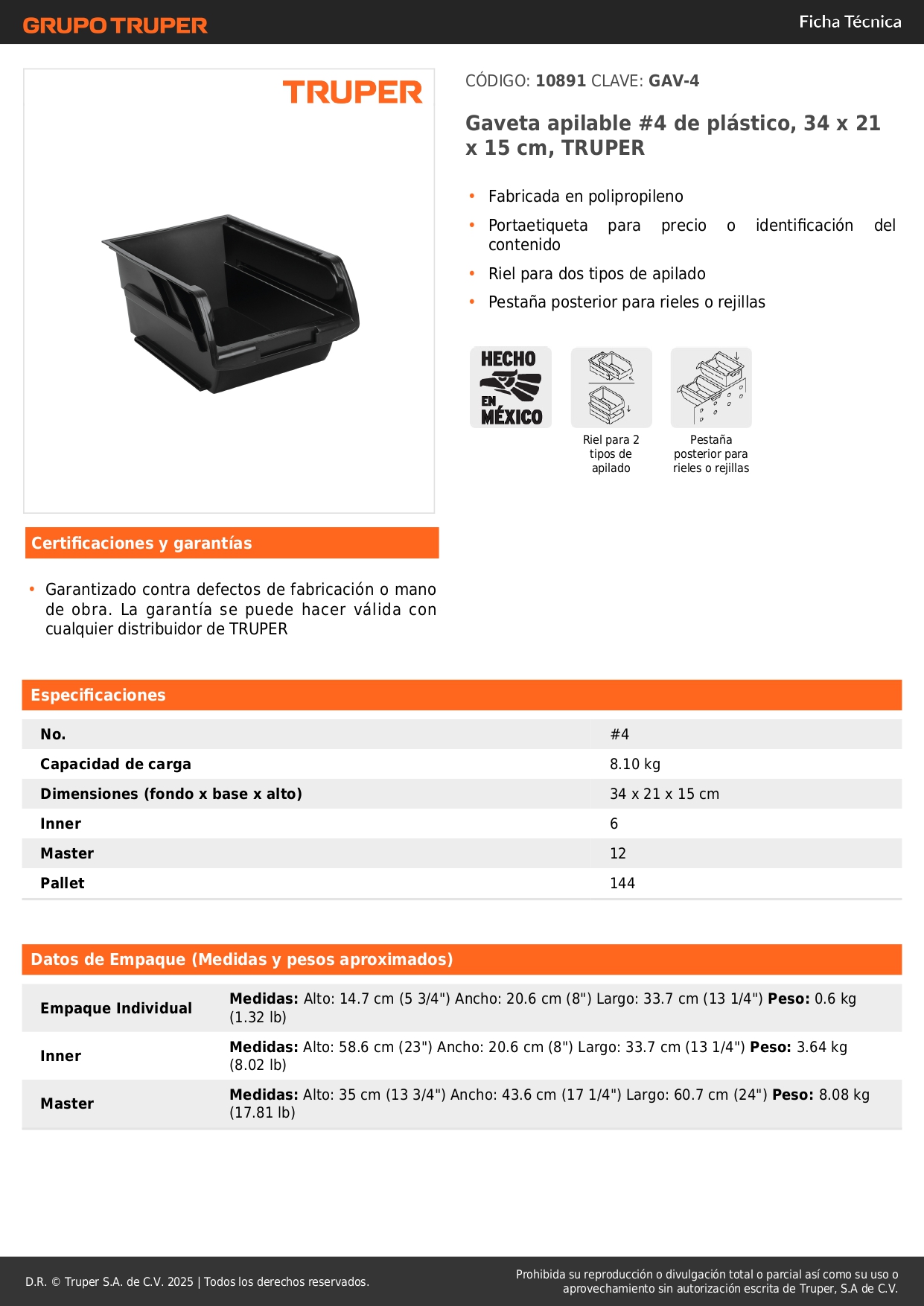 Gaveta apilable #4 de plástico, 34 x 21 x 15 cm, TRUPER