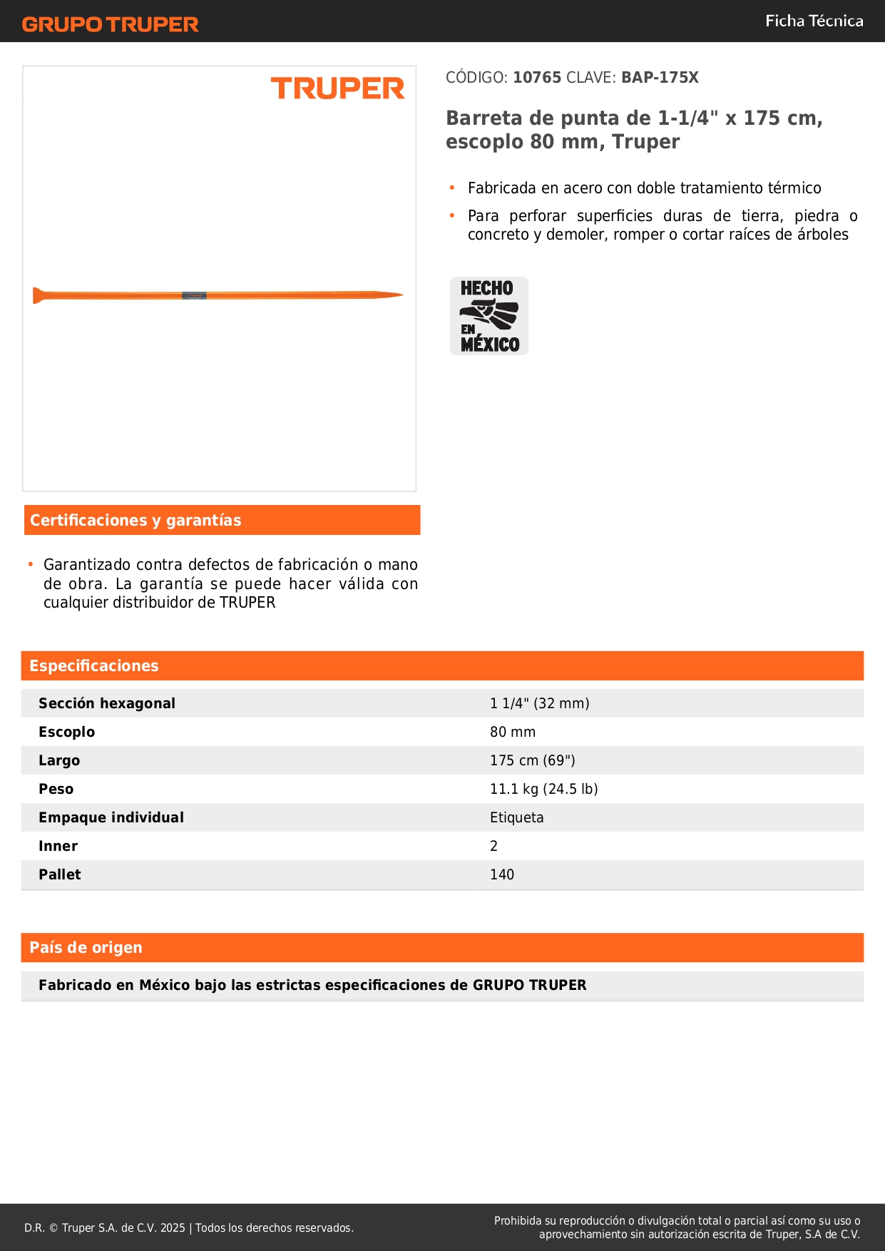 Barreta de punta de 1-1/4'' x 175 cm. escoplo 80 mm Truper