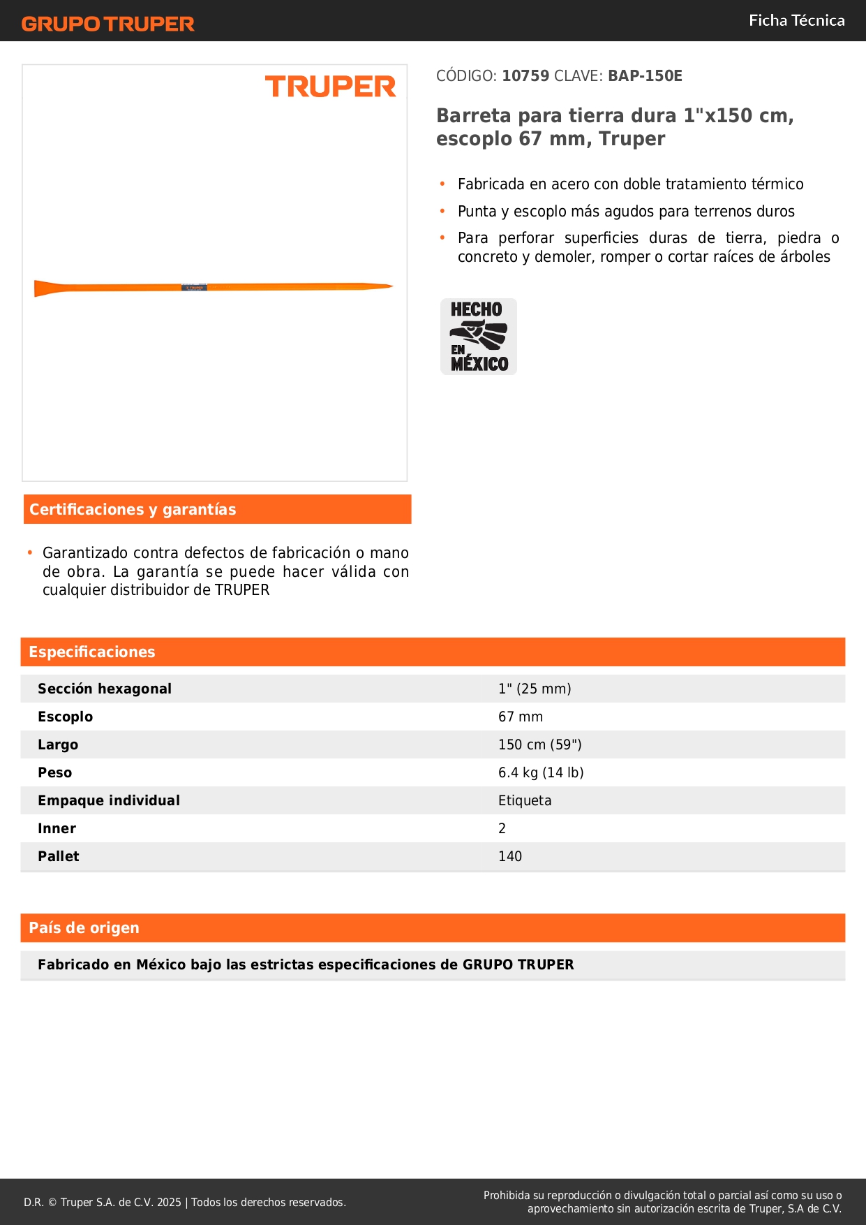 - Fabricada de acero con doble tratamiento térmico.