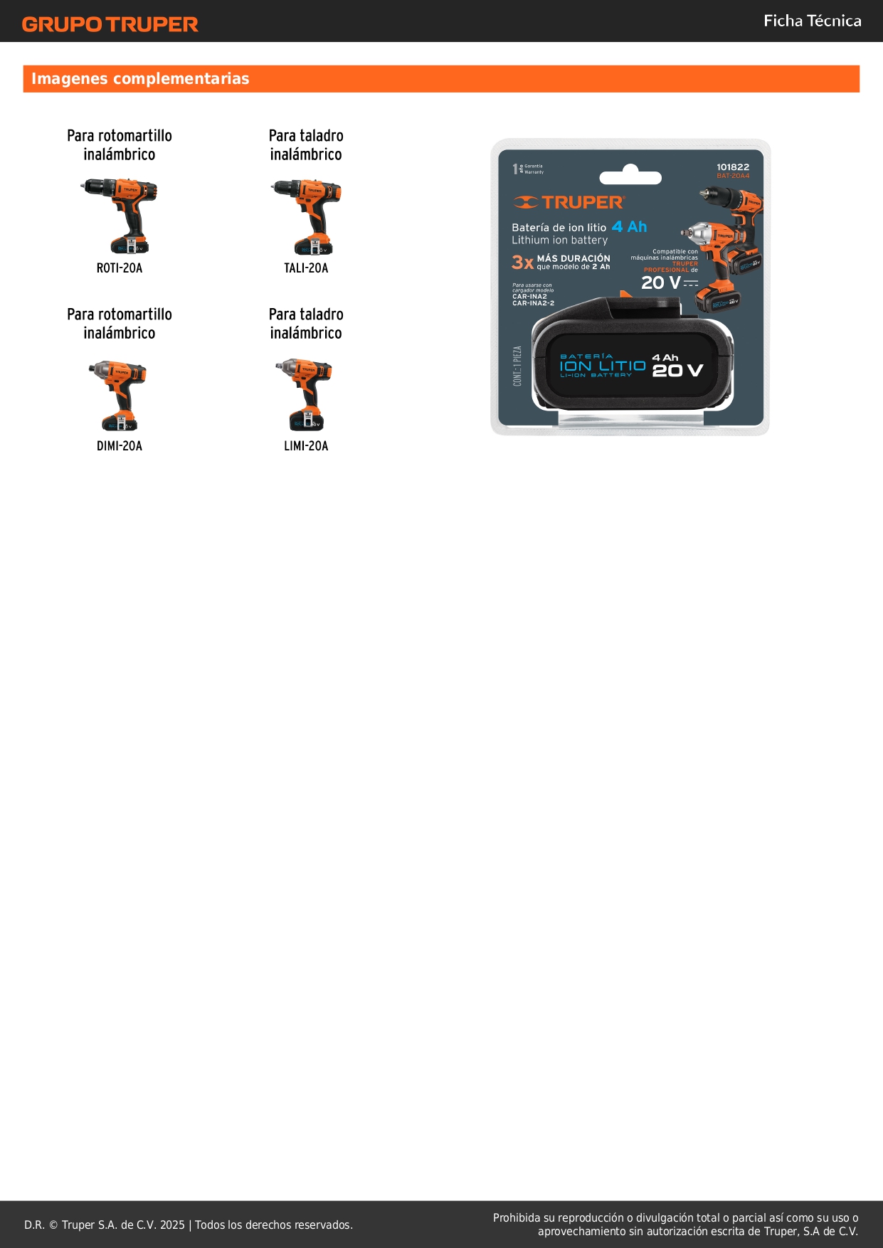 -Para rotomartillo inalámbrico ROTI-20A, taladro inalámbrico TALI-20A, destornillador de impacto DIMI-20A y llave de impacto LIMI-20A marca Truper®