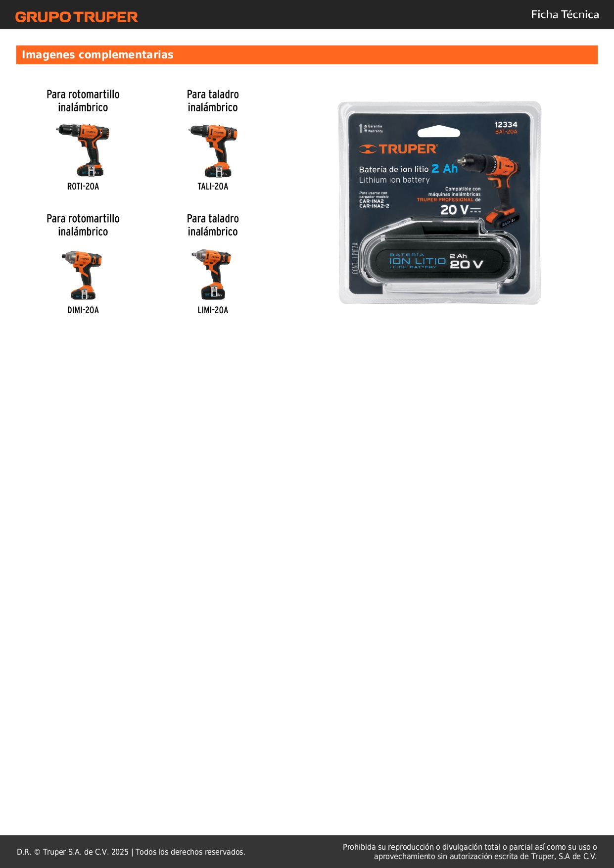 - Para usarse con taladro inalámbrico modelo TAL-18A2, rotomartillo inalámbrico ROTI-18A2 marca Truper.