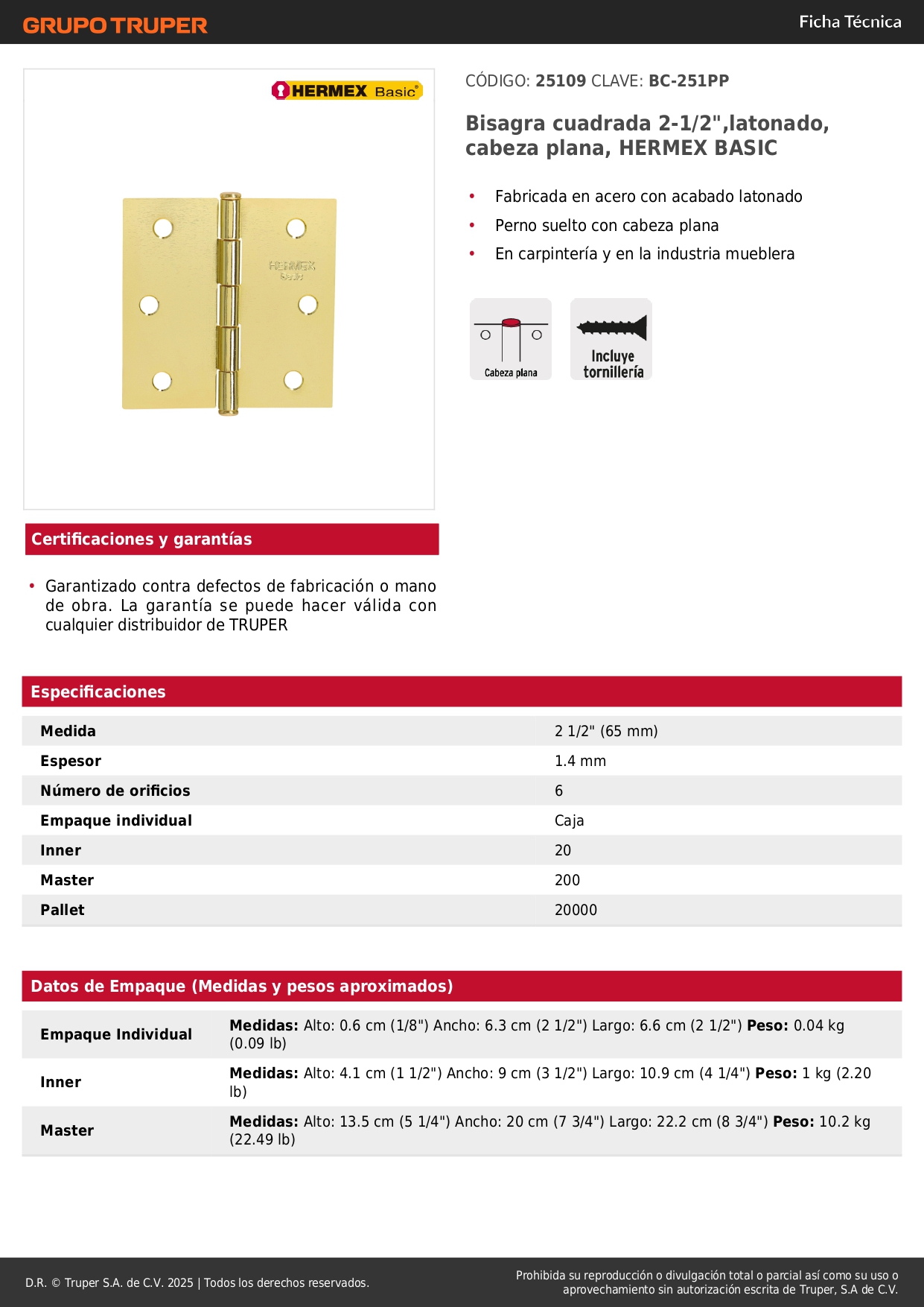 Bisagra cuadrada 2-1/2",latonado, cabeza plana, hermex basic