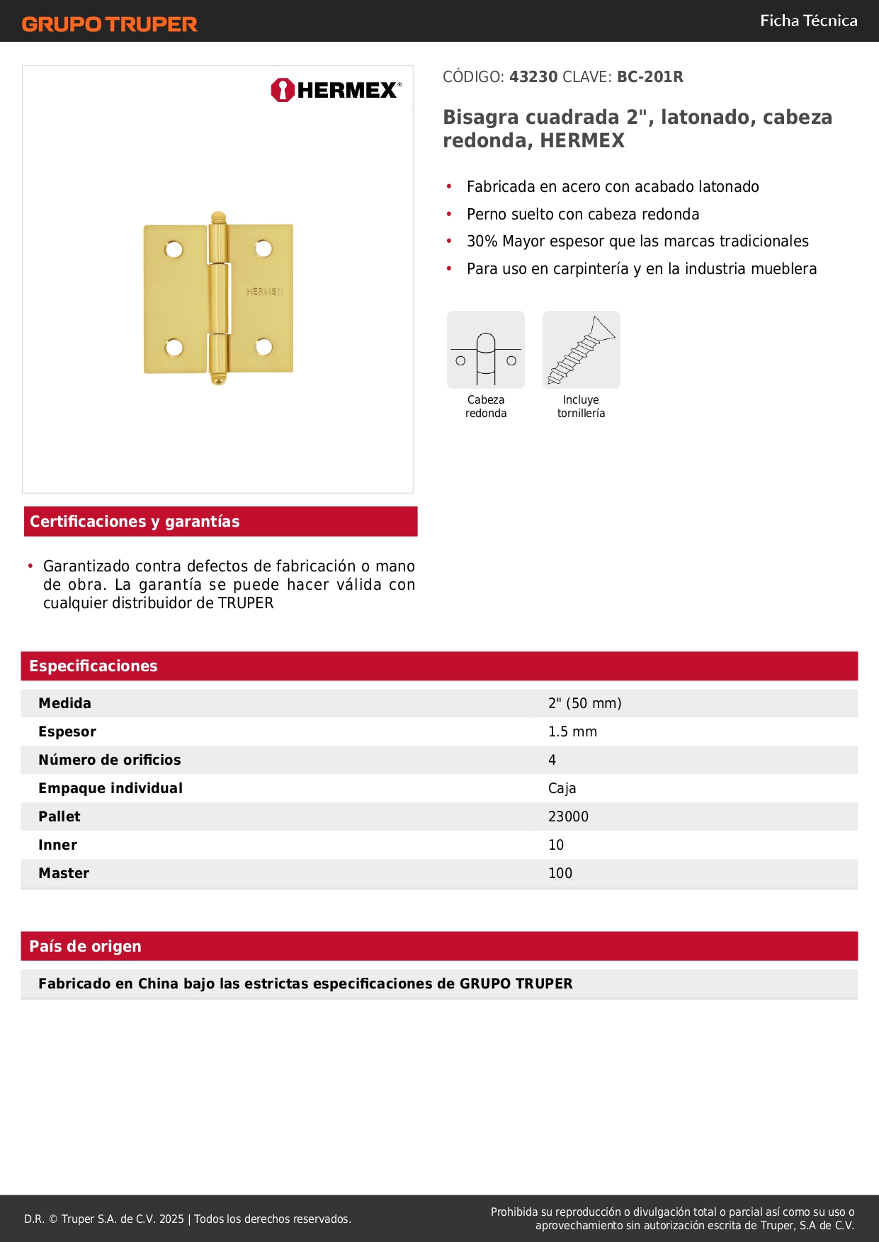 Bisagra cuadrada 2", latonado, cabeza redonda, hermex
