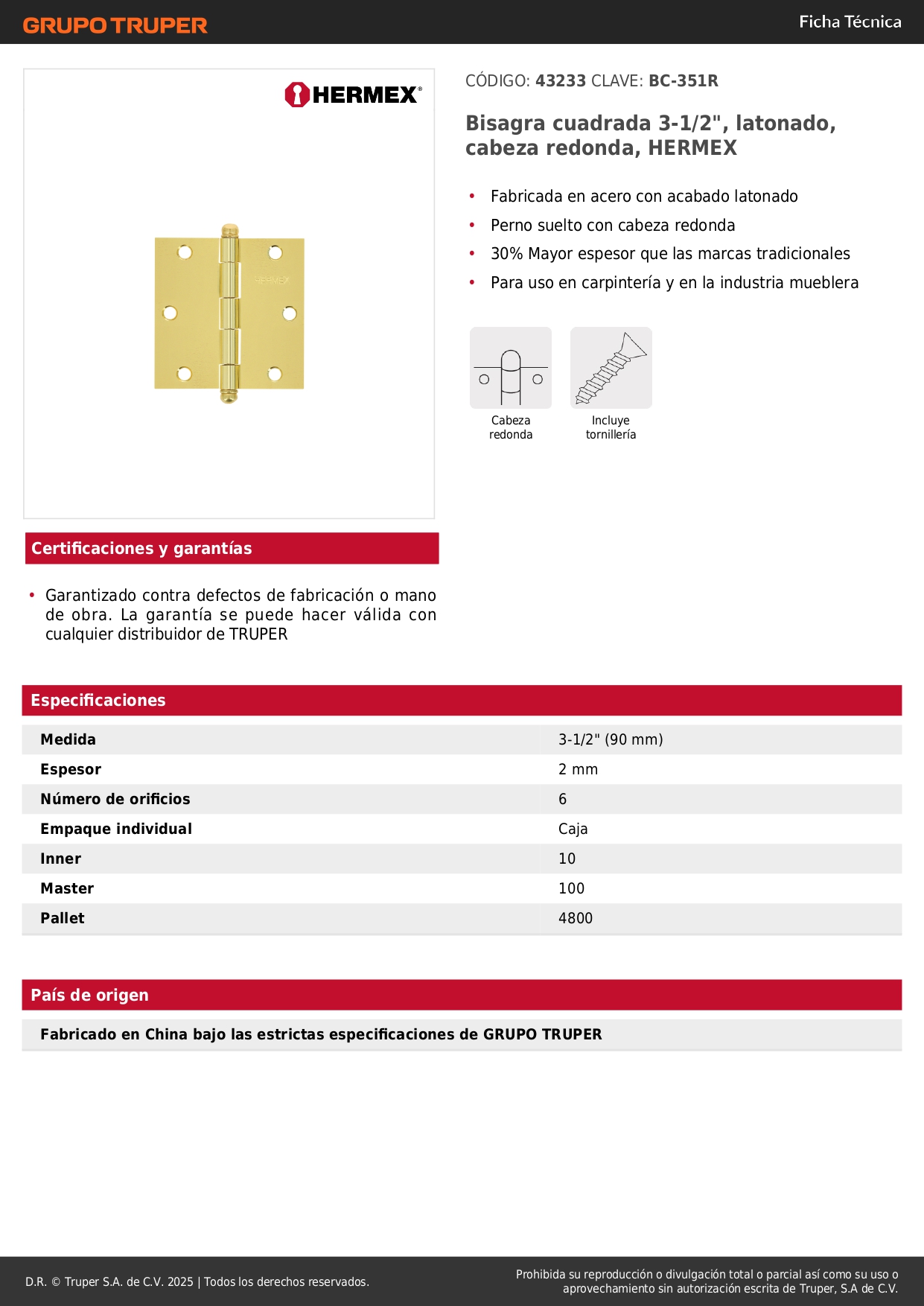 Bisagra cuadrada 3-1/2", latonado, cabeza redonda, hermex