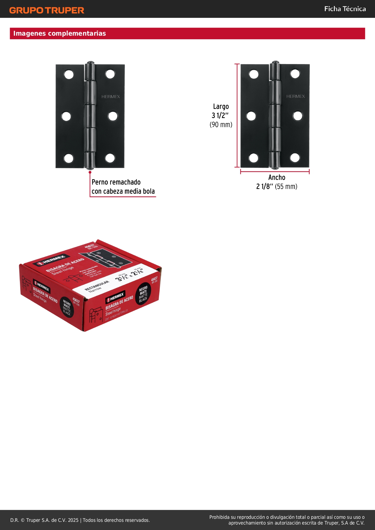 Bisagra rectangular 3-1/2" negra, hermex (Caja de 10 unidades)