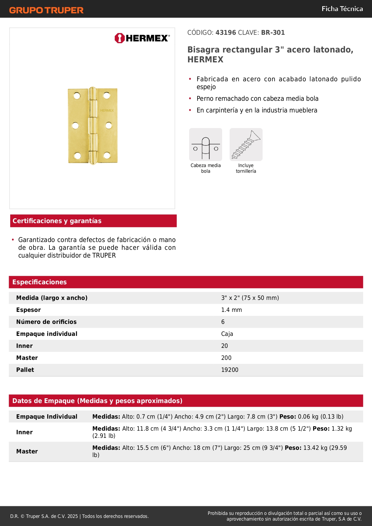 Bisagra rectangular 3´´acabado dorado, cabeza media bola, Hermex (Caja de 20 unidades)