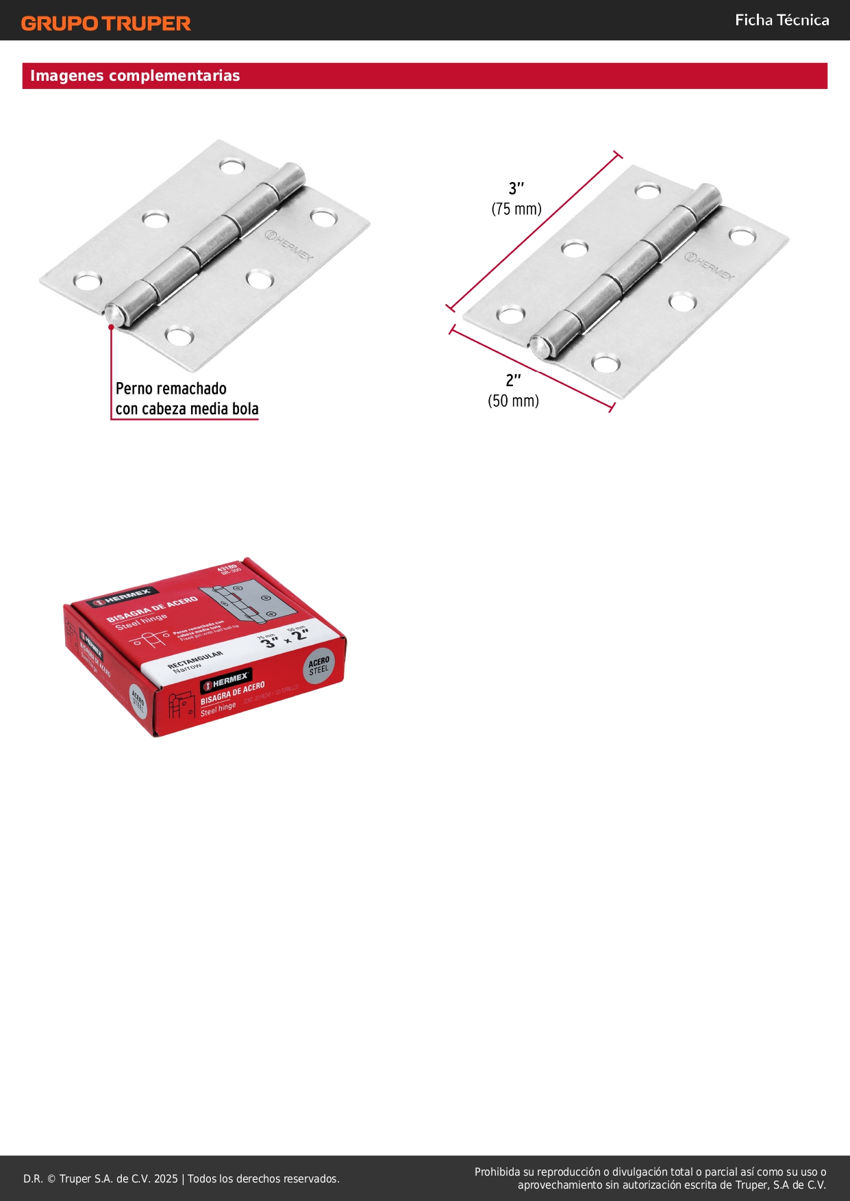 Bisagra rectangular 3´´ acero pulido, cabeza media bola, Hermex (Caja de 20 unidades)
