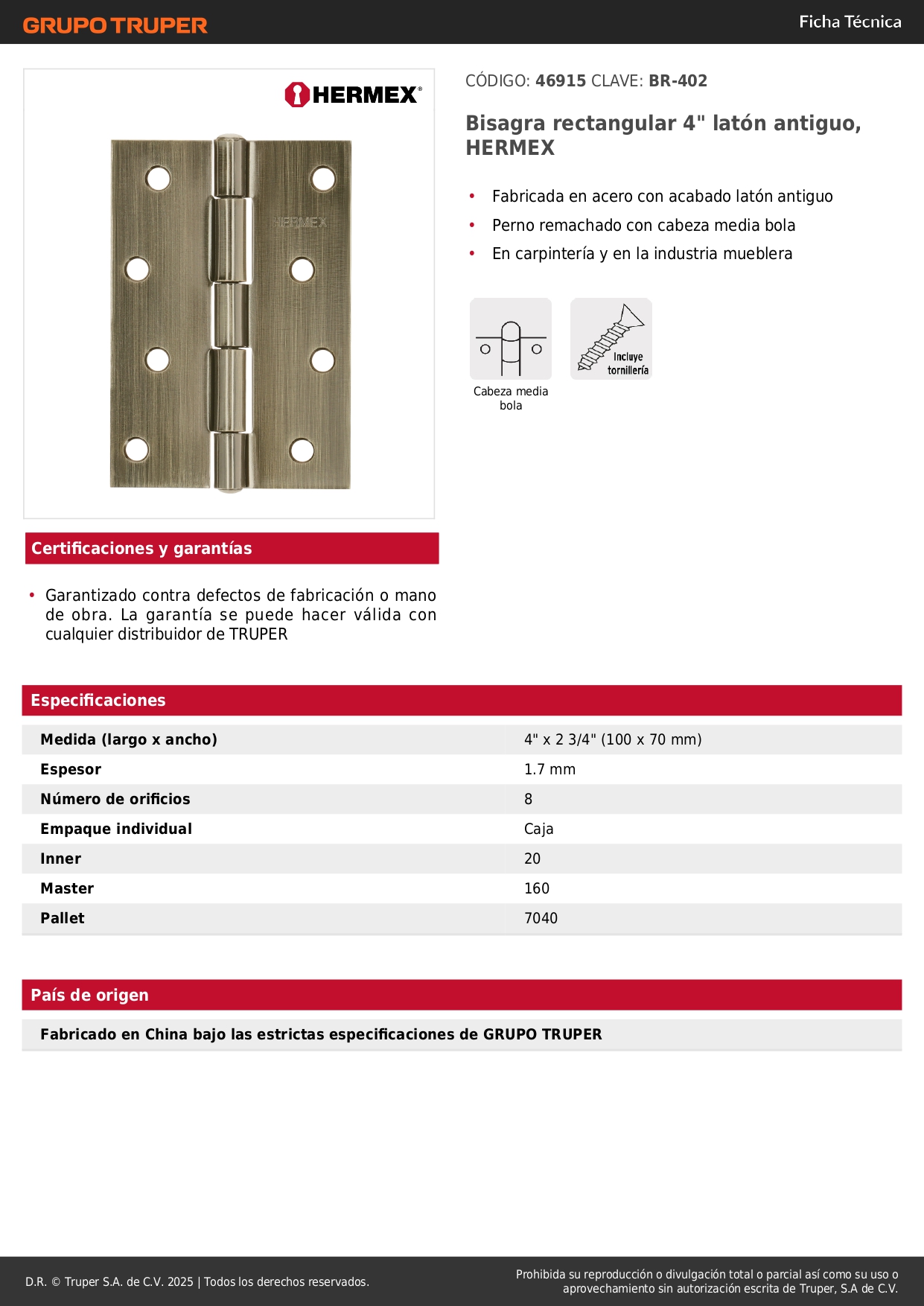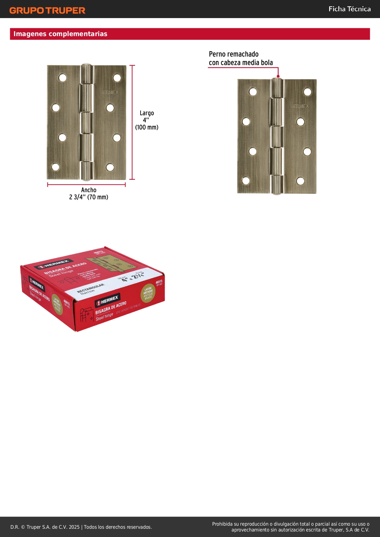 Bisagra rectangular 4" latón antiguo, hermex (Caja de 20 unidades)