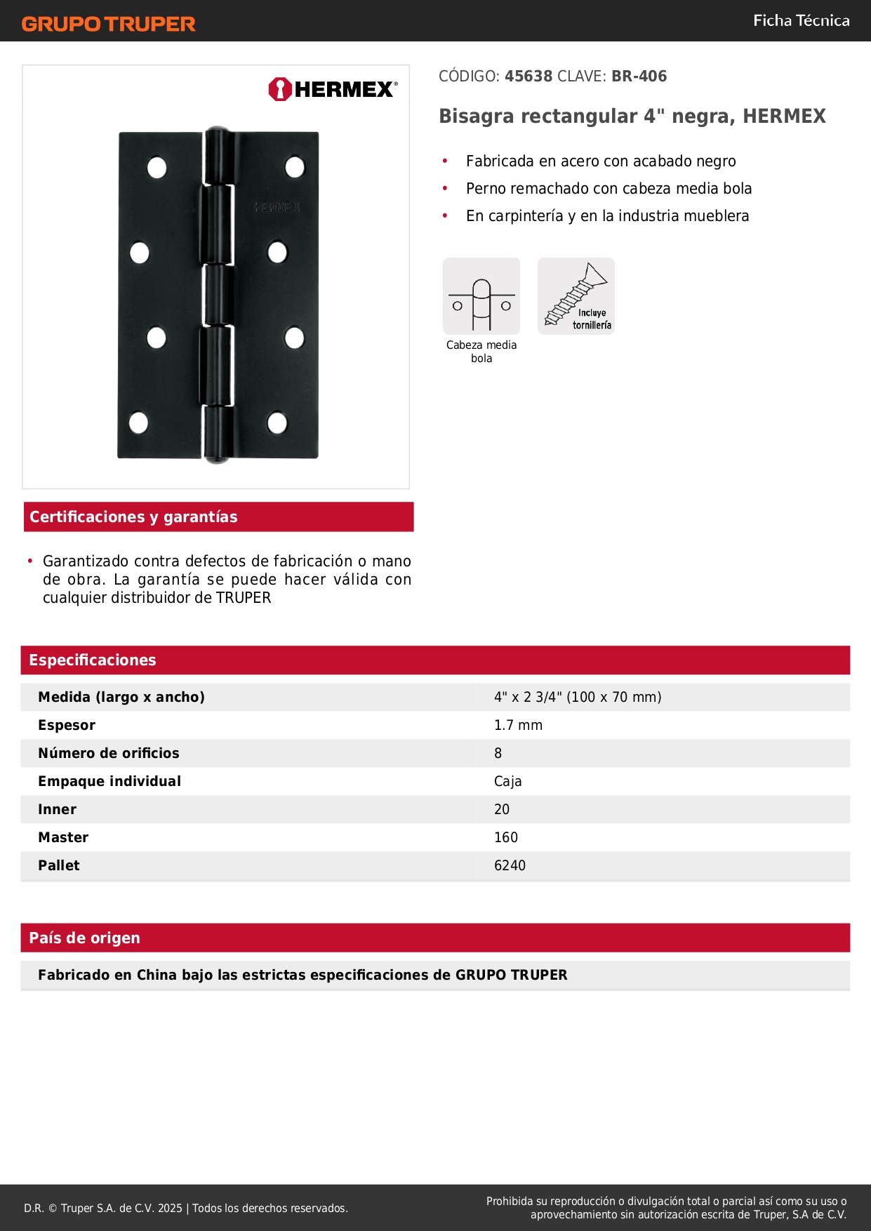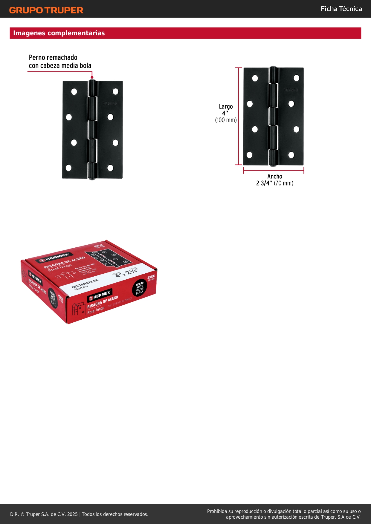 Bisagra rectangular 4" negra, hermex (Caja de 20 unidades)