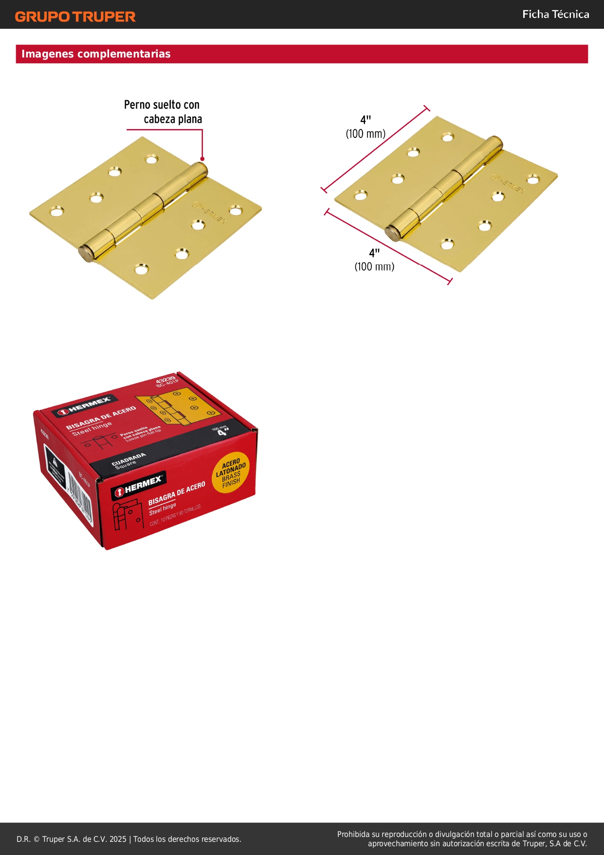 Bisagra tipo capuchina 4´´ acero latonado, plana, Hermex