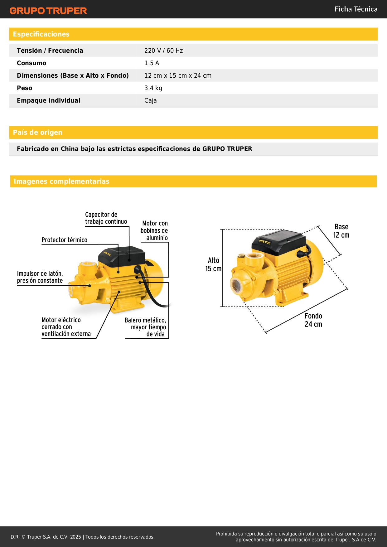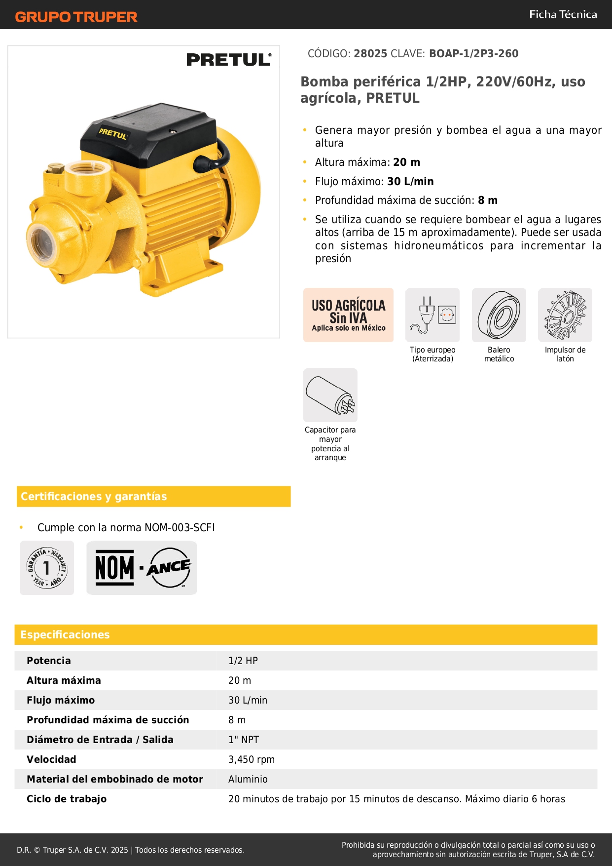 Bomba periférica 1/2HP, 220V/60Hz, uso agrícola, PRETUL