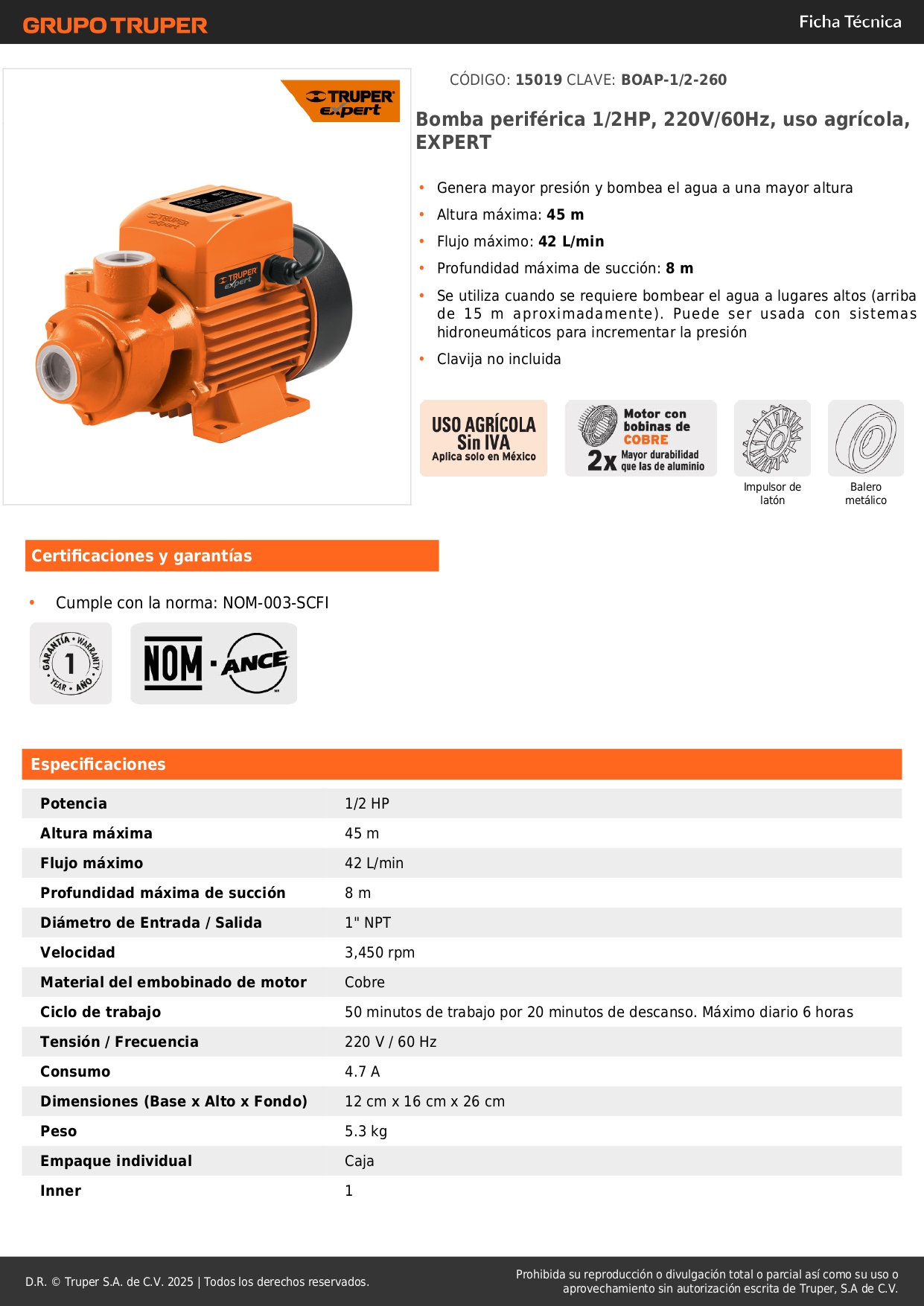 Bomba periférica 1/2HP, 220V/60Hz, uso agrícola, EXPERT