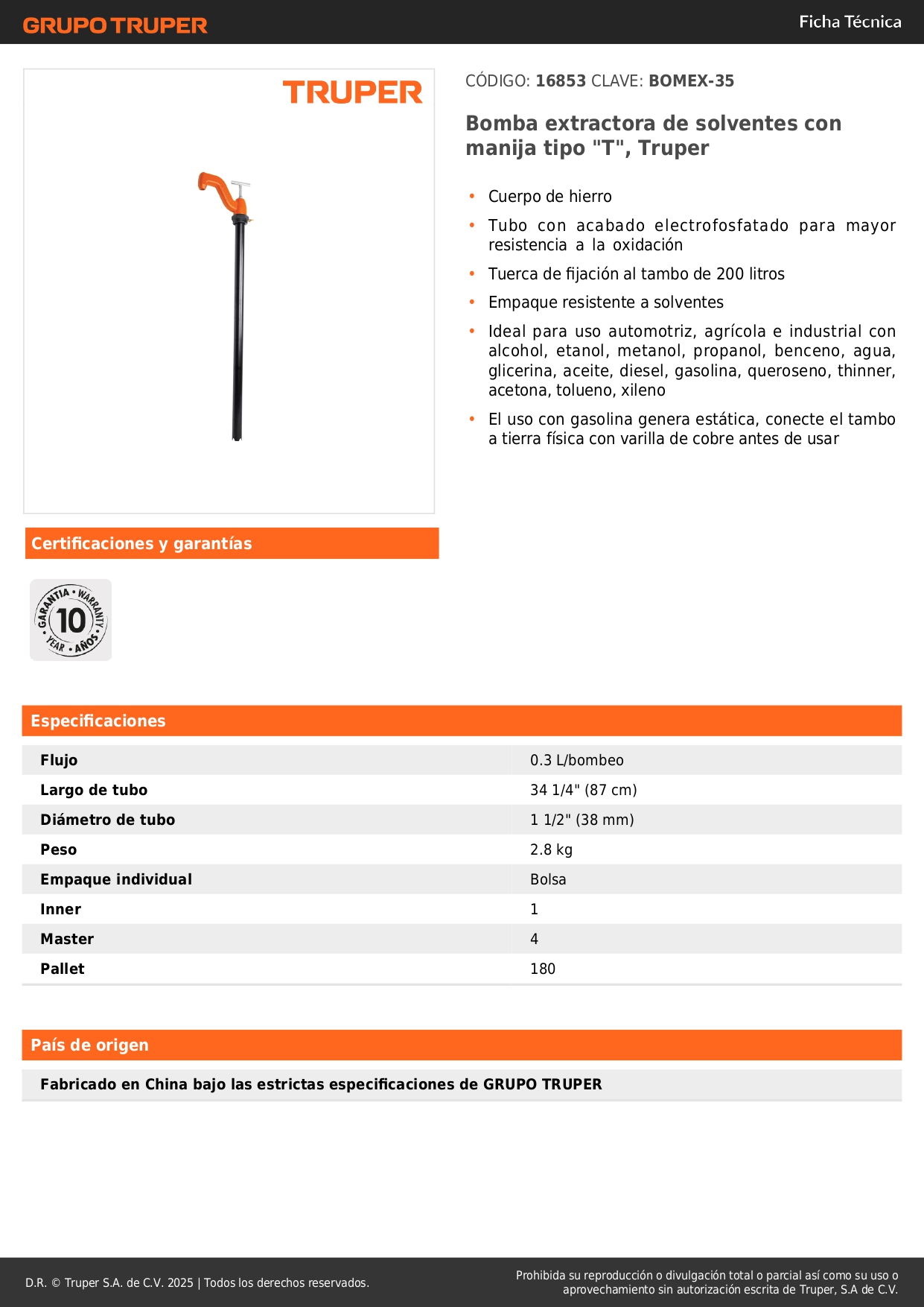 Bomba extractora de solventes con manija tipo "t" Truper