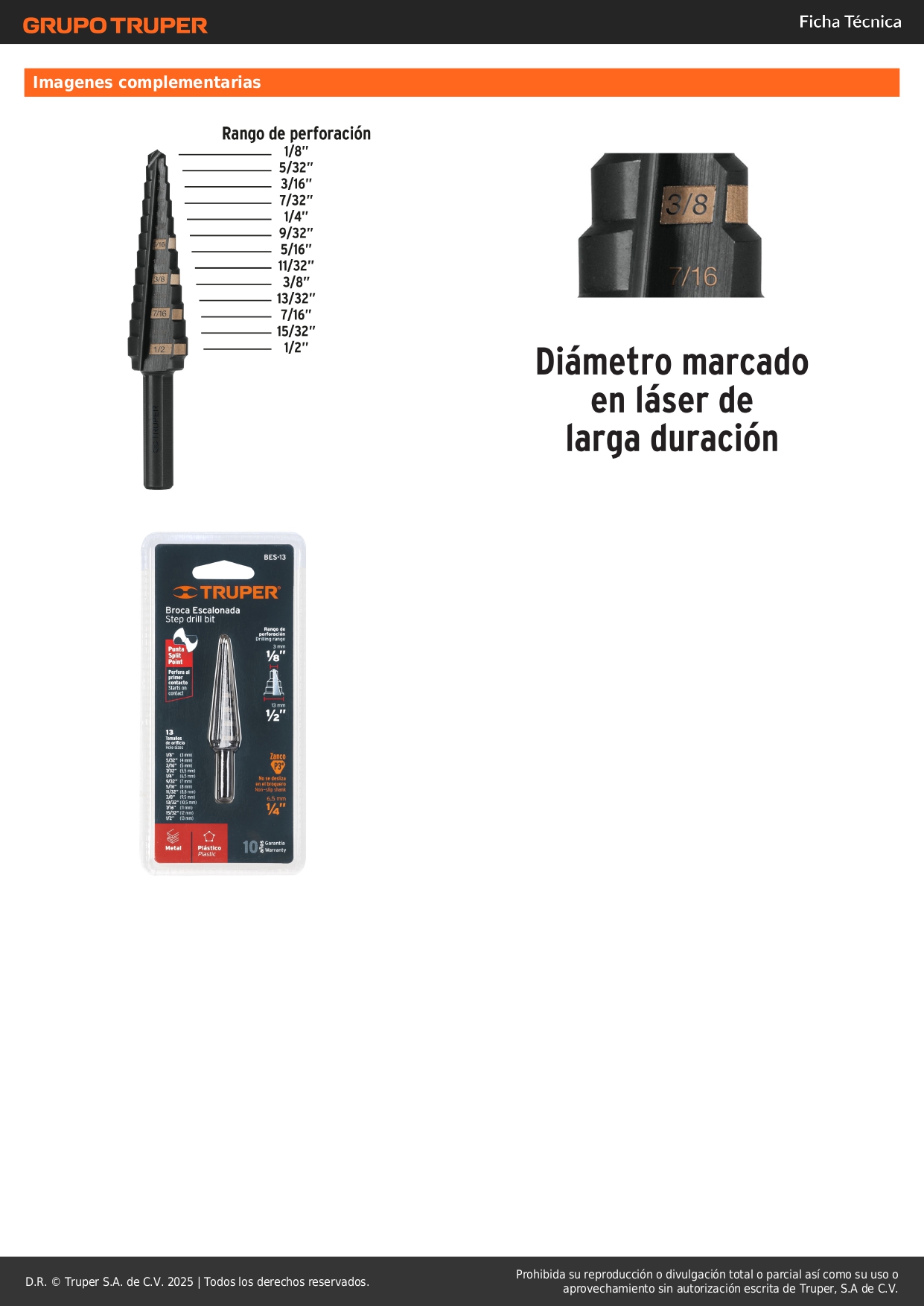 - Diámetro marcado en láser de larga duración para identificar rápidamente el tamaño a perforar.