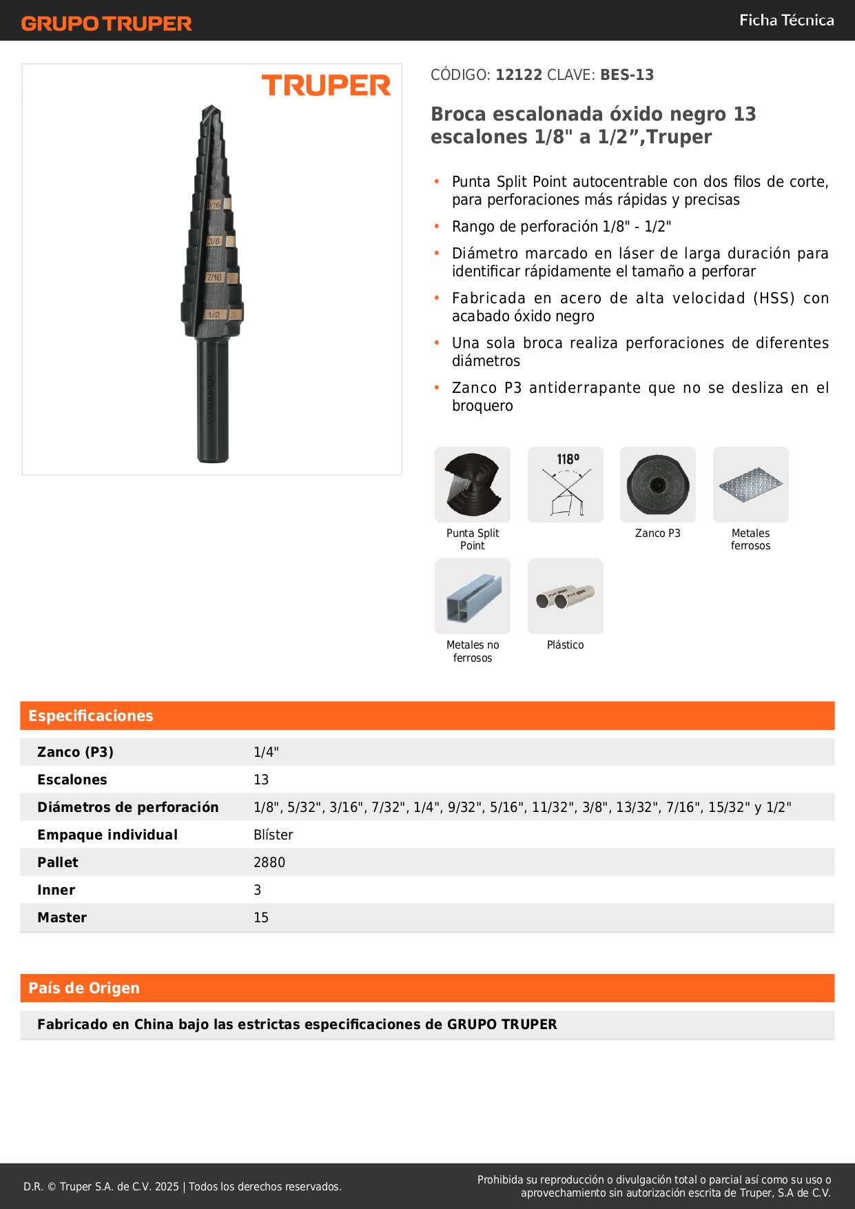 - Punta Split Point autocentrable con dos filos de corte, para perforaciones más rápidas y precisas.