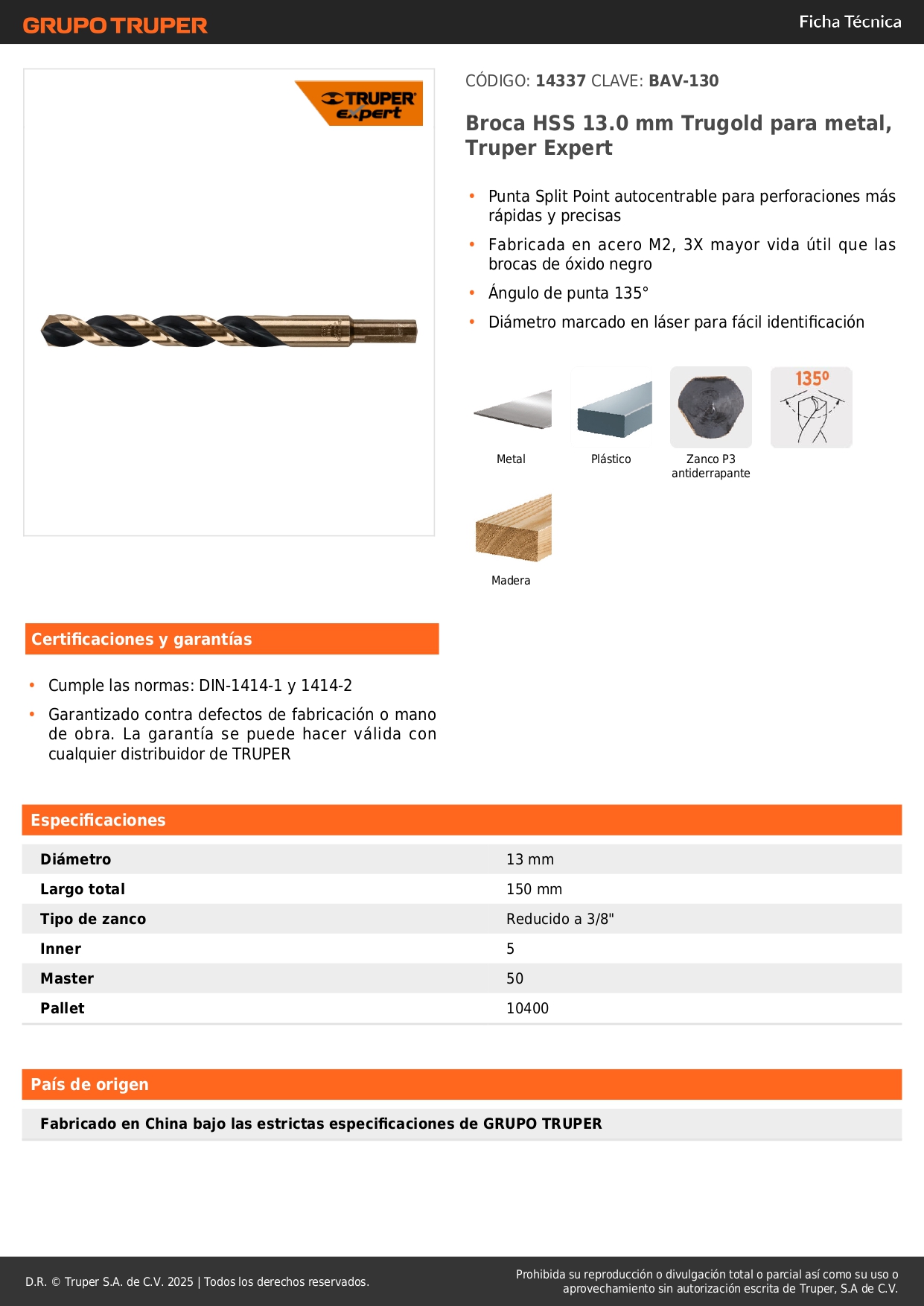 Broca HSS 13.0 mm Trugold para metal, Truper Expert por unidad