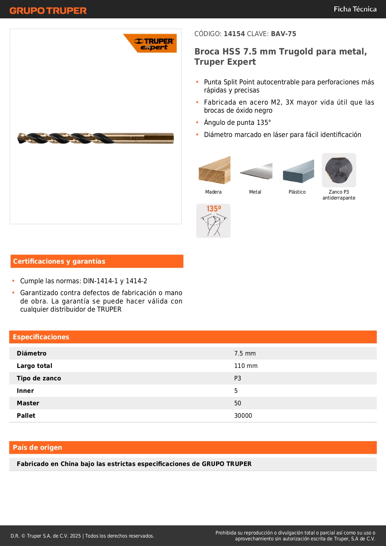 Broca HSS 7.5 mm Trugold para metal, Truper Expert por unidad