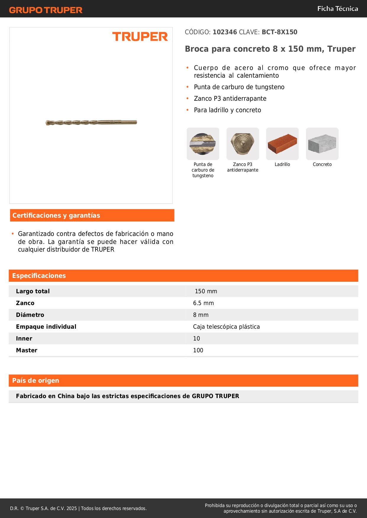 Broca para concreto 8 x 150 mm, Truper por unidad