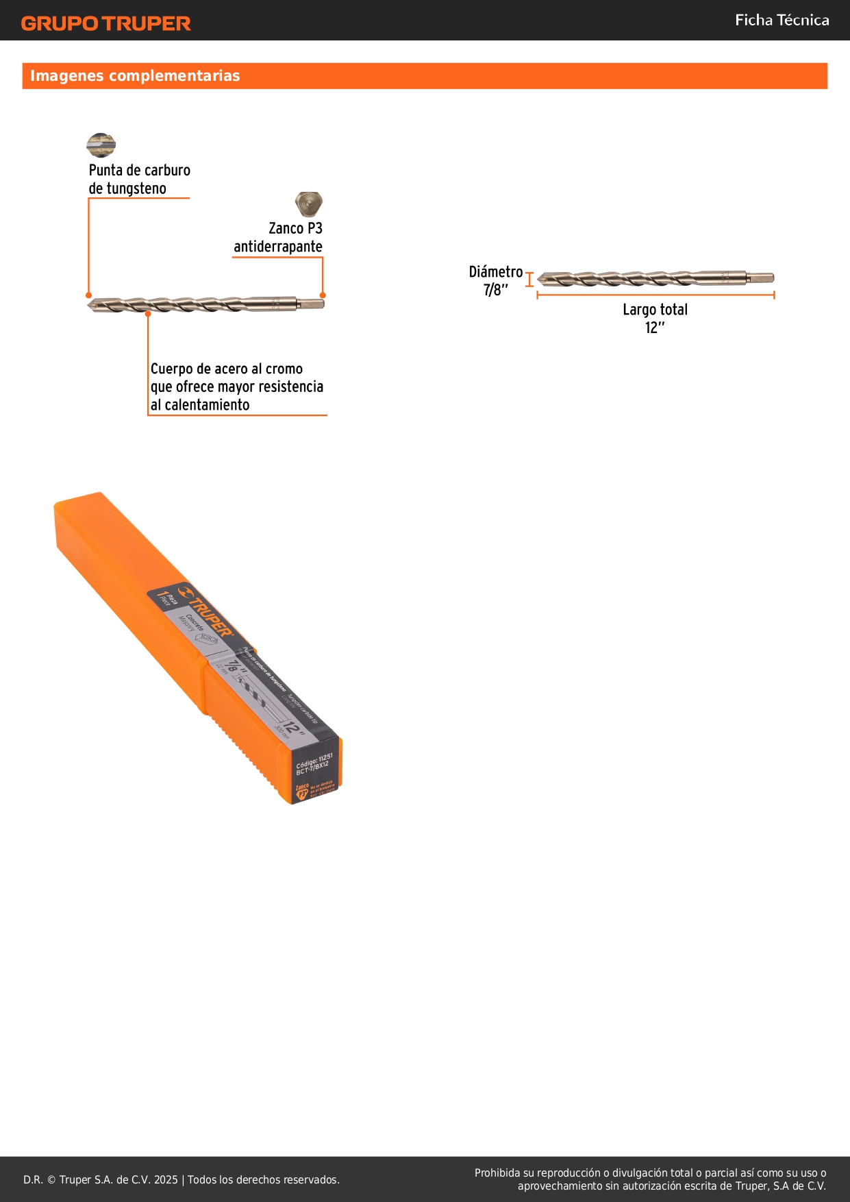 Broca para concreto de 7/8 x 12", Truper (Caja con 1 Unidad)