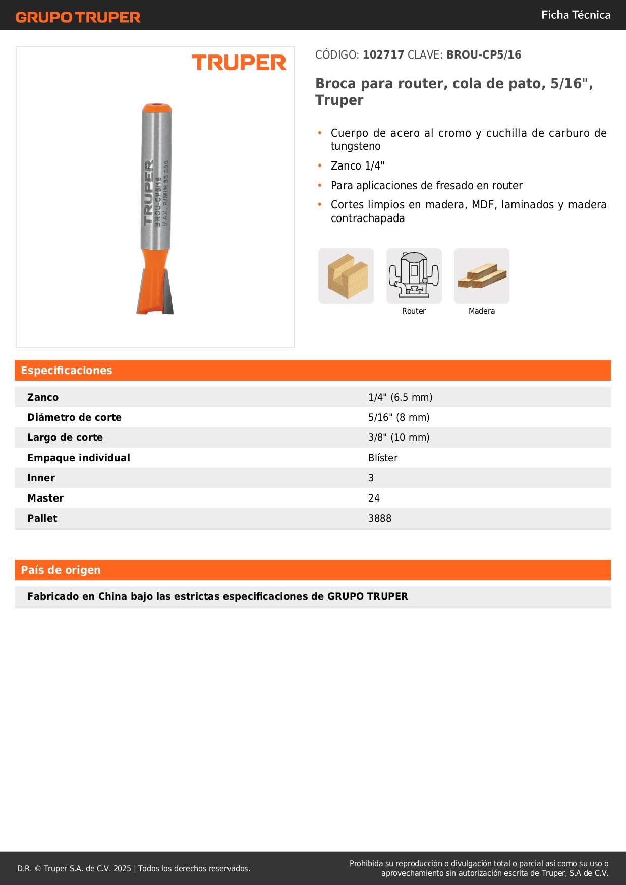 Broca para router, cola de pato, 5/16', Truper