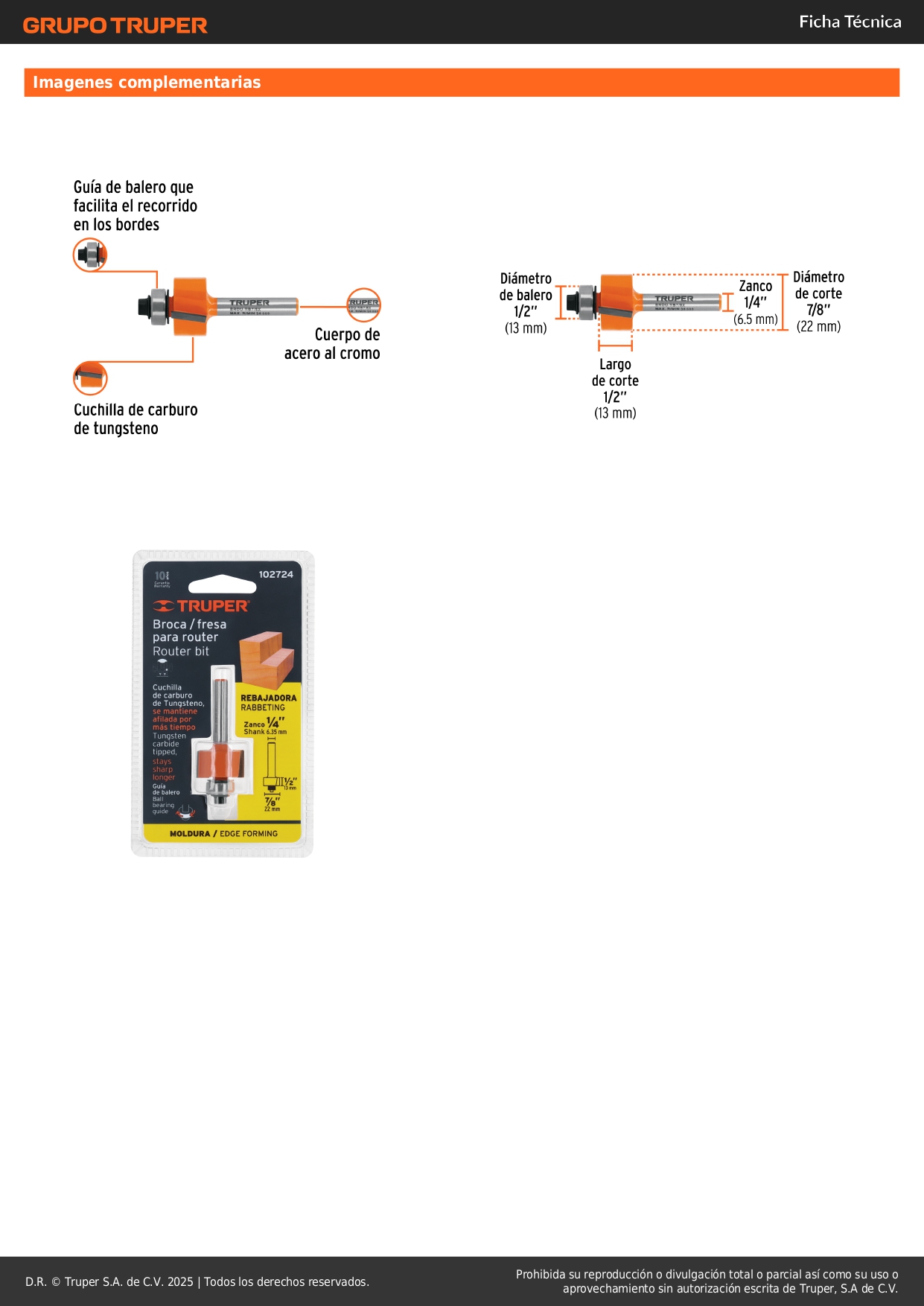 Broca para router, rebajado, 7/8' con balero, Truper