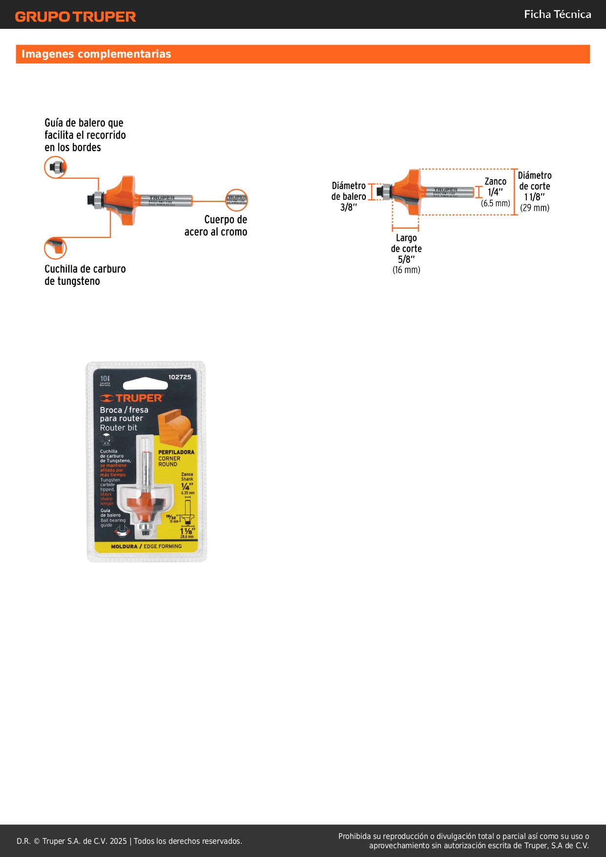 Broca para router, redondeado con moldura, 1-1/8´´ con balero Truper