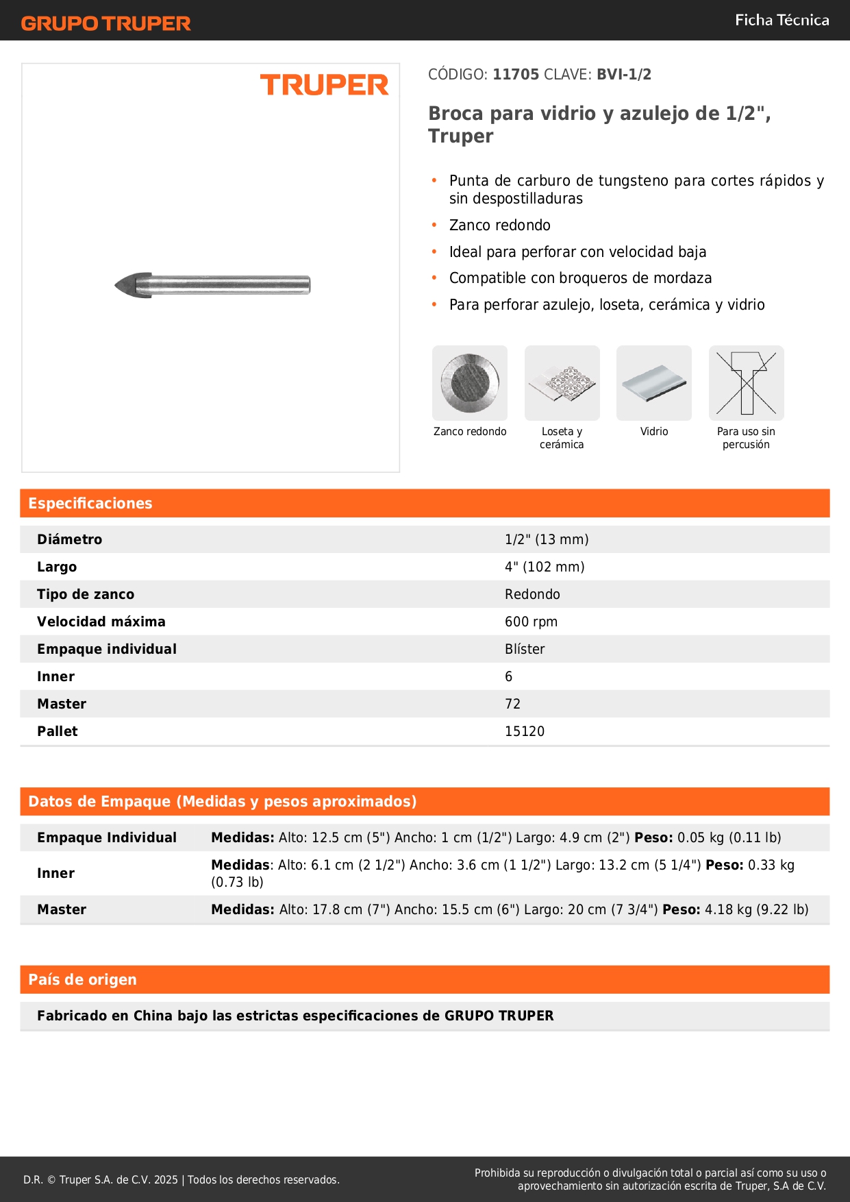 Broca para vidrio y mayólica de 1/2´´, Truper