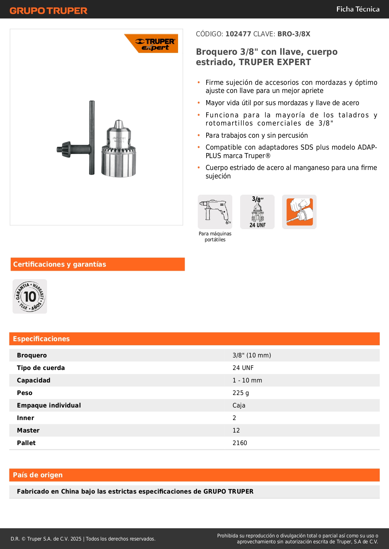 Broquero uso rudo con llave, 3/8´´, Truper