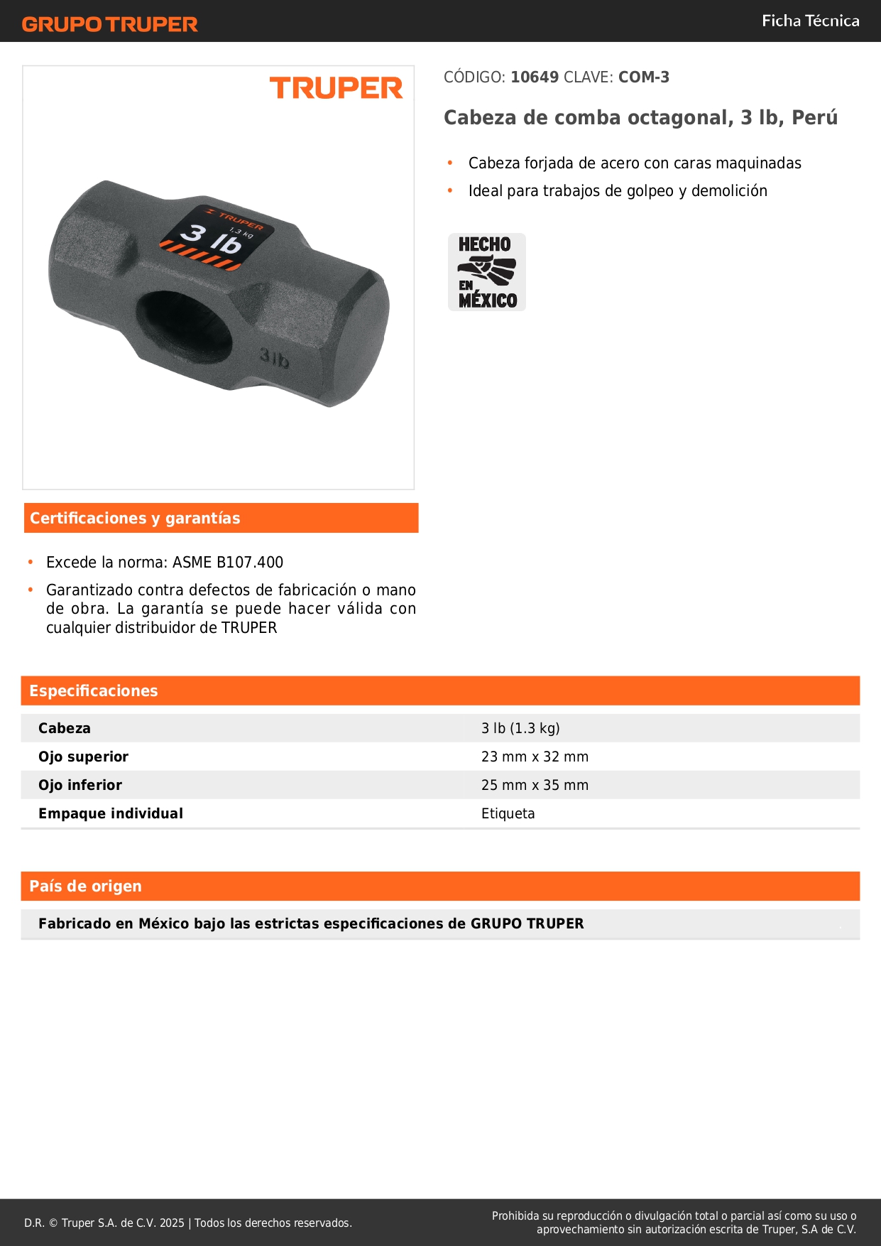 Cabeza de comba octagonal de 3 lb, Truper Stock por sucursal Stock por sucursal S/ 17.70 cantidad Agregar al carro Avísame cuando llegue -Cabeza forjada de acero con caras maquinadas-Ideal para trabajos de golpeo y demolición
